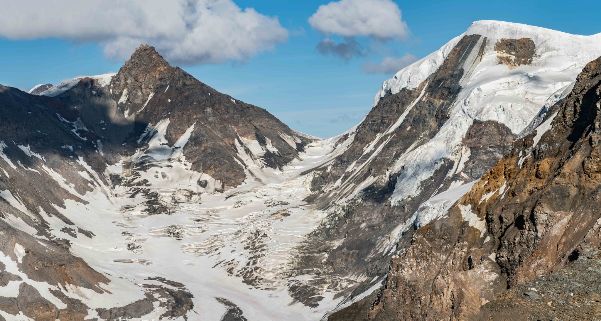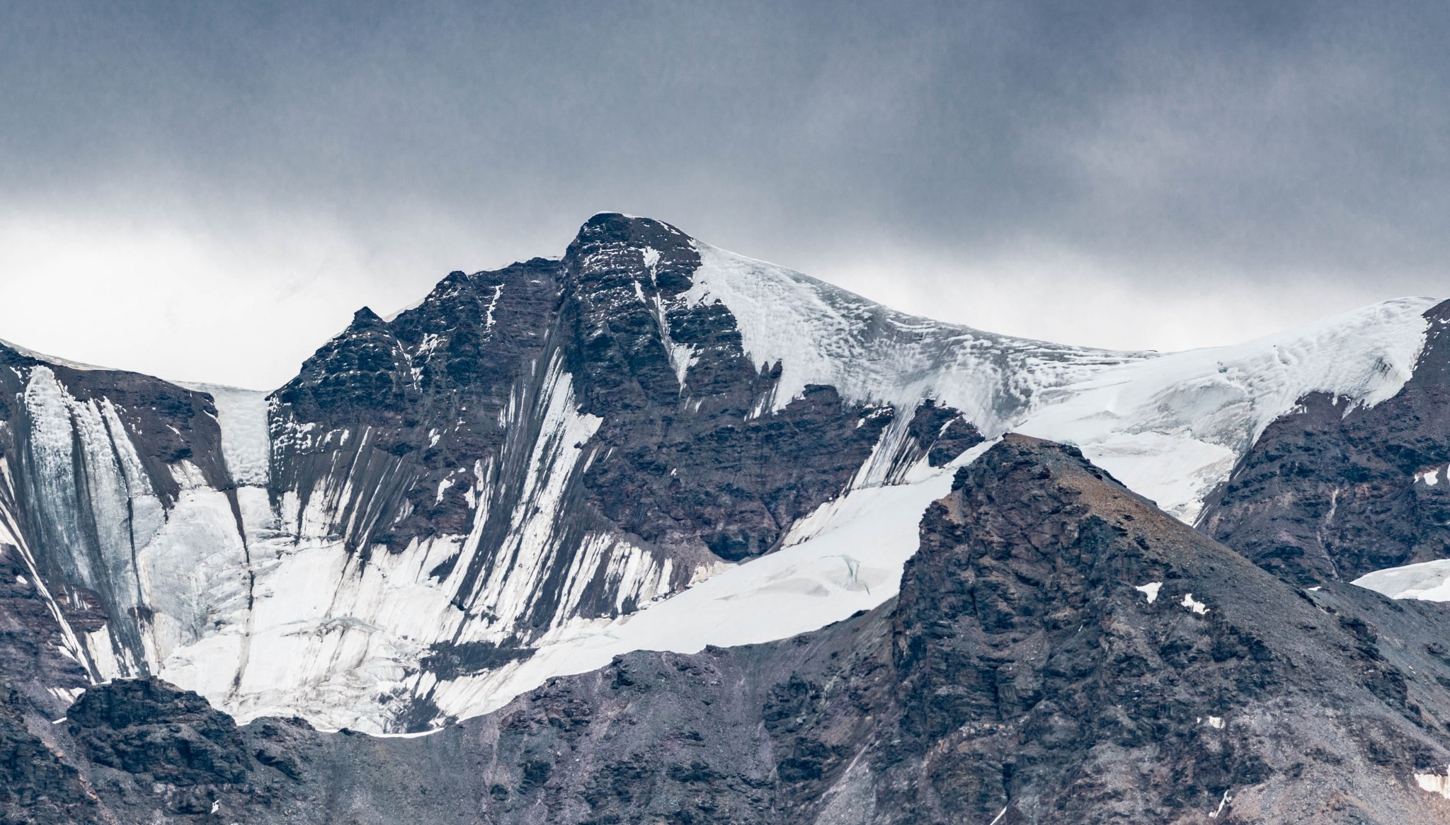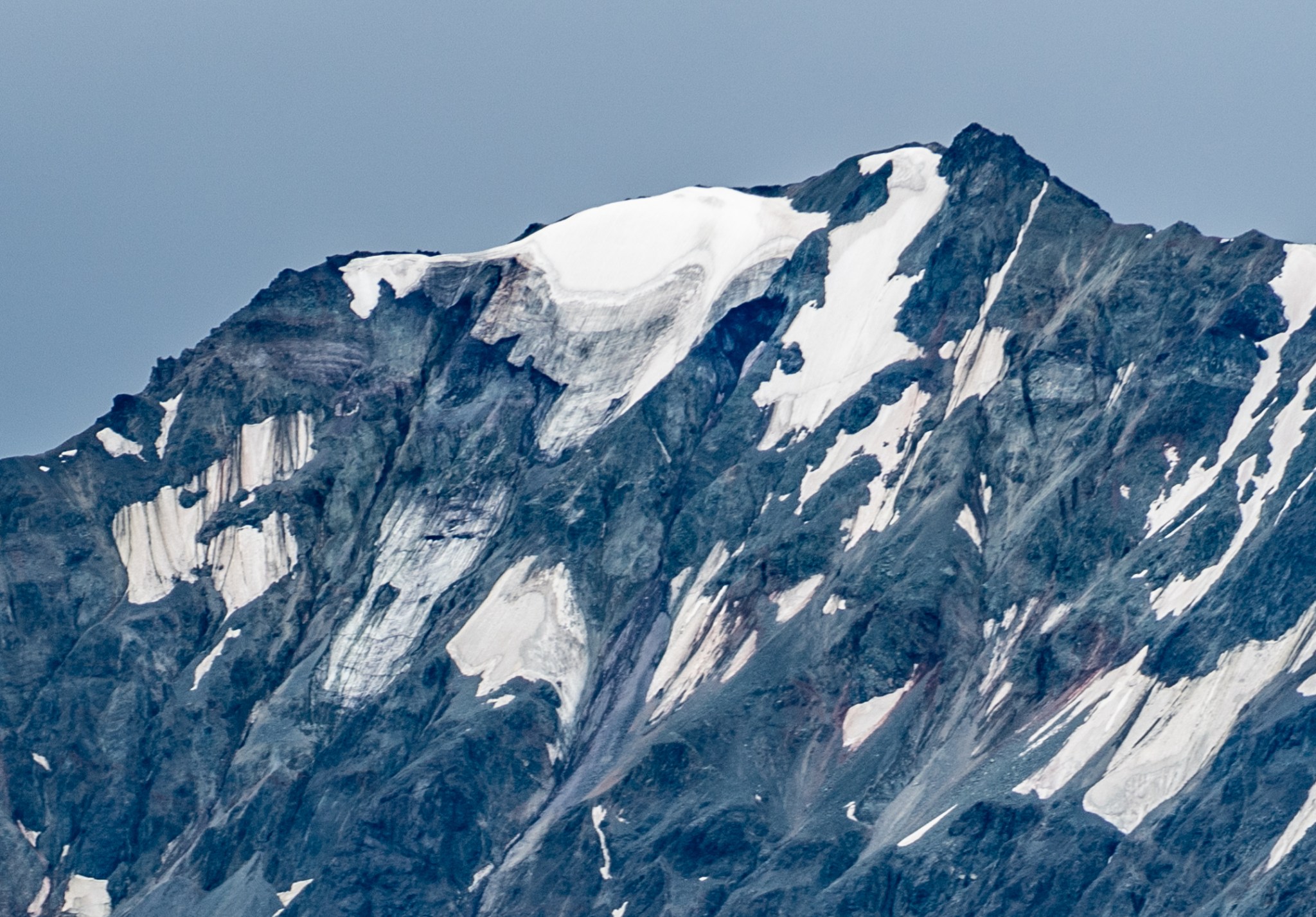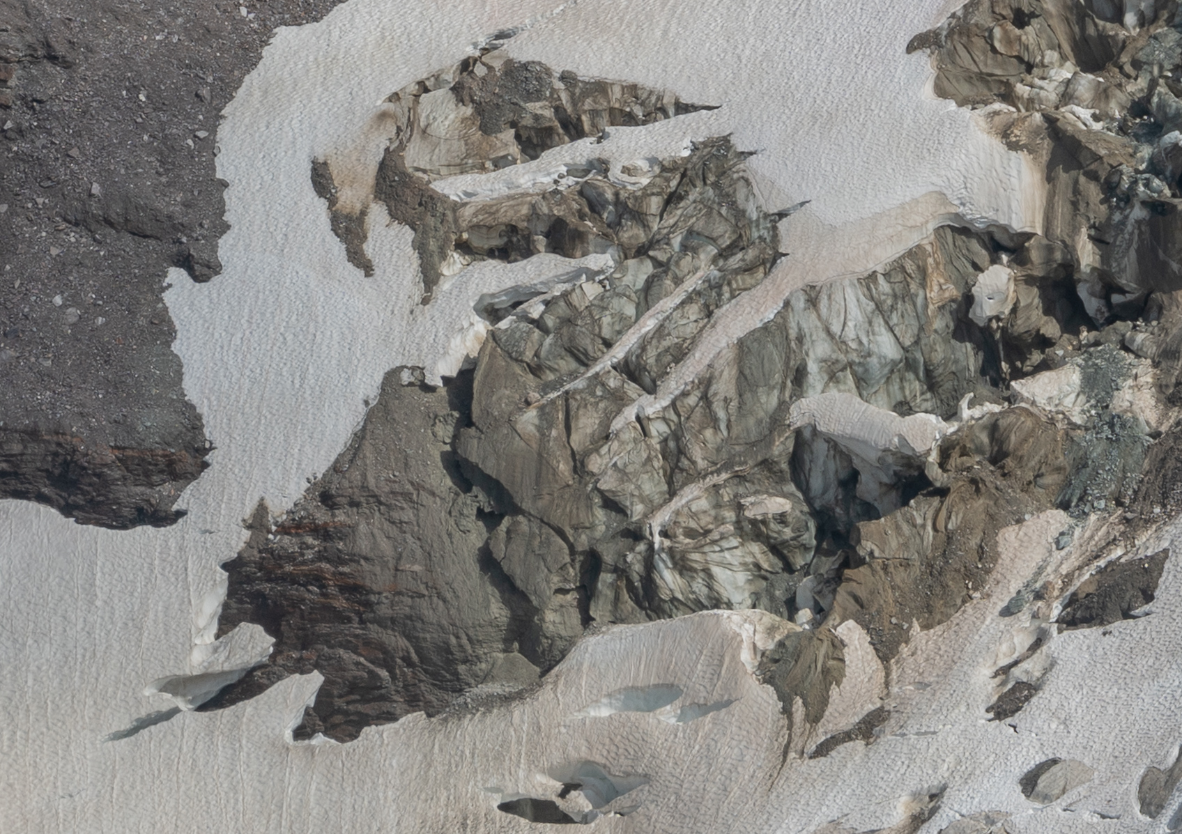 The part of the ridge past T3 was far more spectacular than the previous section: massive cornices transitioned seamlessly into hanging ice at the top of the Broken Glacier. From below, the Broken Glacier seems nearly extinct, but from above the ice is still quite crevassed and thick, despite decades of climate change accelerated thinning. I occasionally would carefully step out to the edge of the ridge and looked over, making sure I was on solid rock and not overhanging scree. Only once I saw fresh rocks falling below me and wisely step back a few paces, but for the most part the ridge was quite secure. The thick hanging ice below me was gobsmackingly beautiful and I could see various layers of snow.