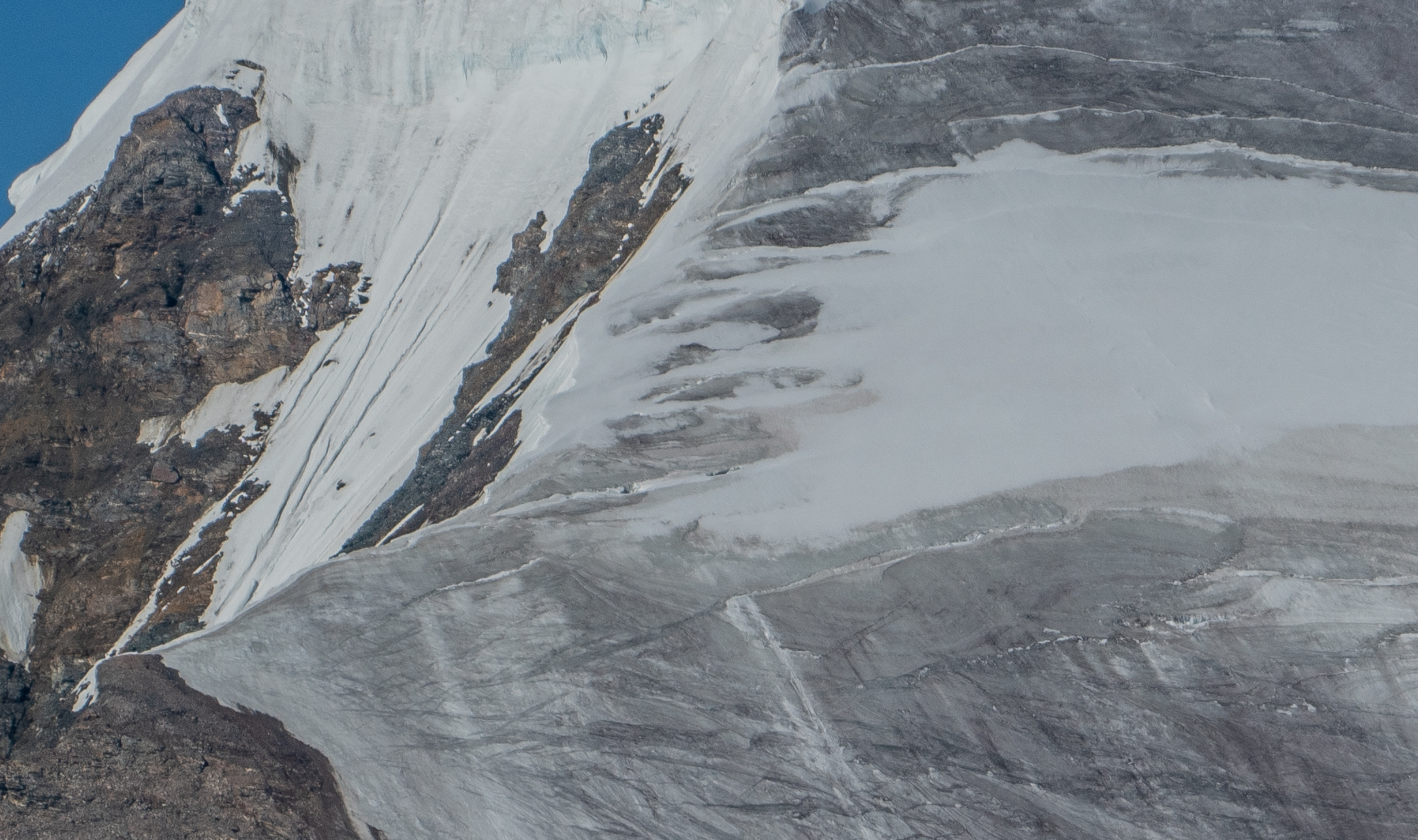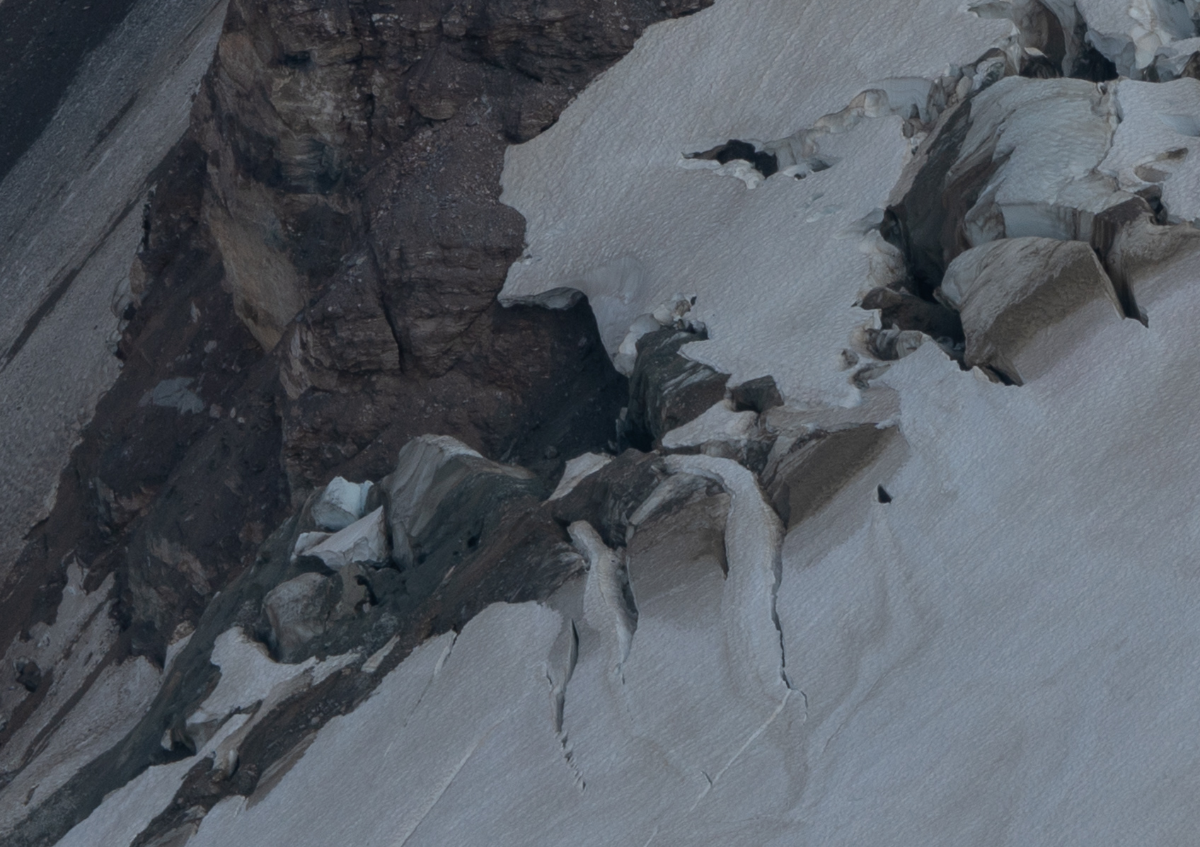 Finally: 8,600′ to 9,800′ in crisp detail. There’s those summit cracks! Filled with snow but visible, I count at least 7 on the middle section of ridge and a few up top. It looks as though the summit fin is a glacial feature caused by the subglacial intersection of at least 4 ridgelines (NW, SW, NE, SE). There’s probably a little bump of rock on top of which the glaciers sit. It’s amazing the fin is glacier ice, I’d assume it would want to pull apart, the yearly accumulation of rime and snow must be sufficient to keep it from melting out. There was still a little seasonal snow on the slopes, but I’d never seen bare ice at this elevation in the Deltas before. Had I brought my 600mm lens I could have seen individual rime balls on the summit fin, but that seemed unnecessary when 200mm got me this level of detail from 3 miles away and 2,500′ below. There seems to be some sort of hole below the summit fin.