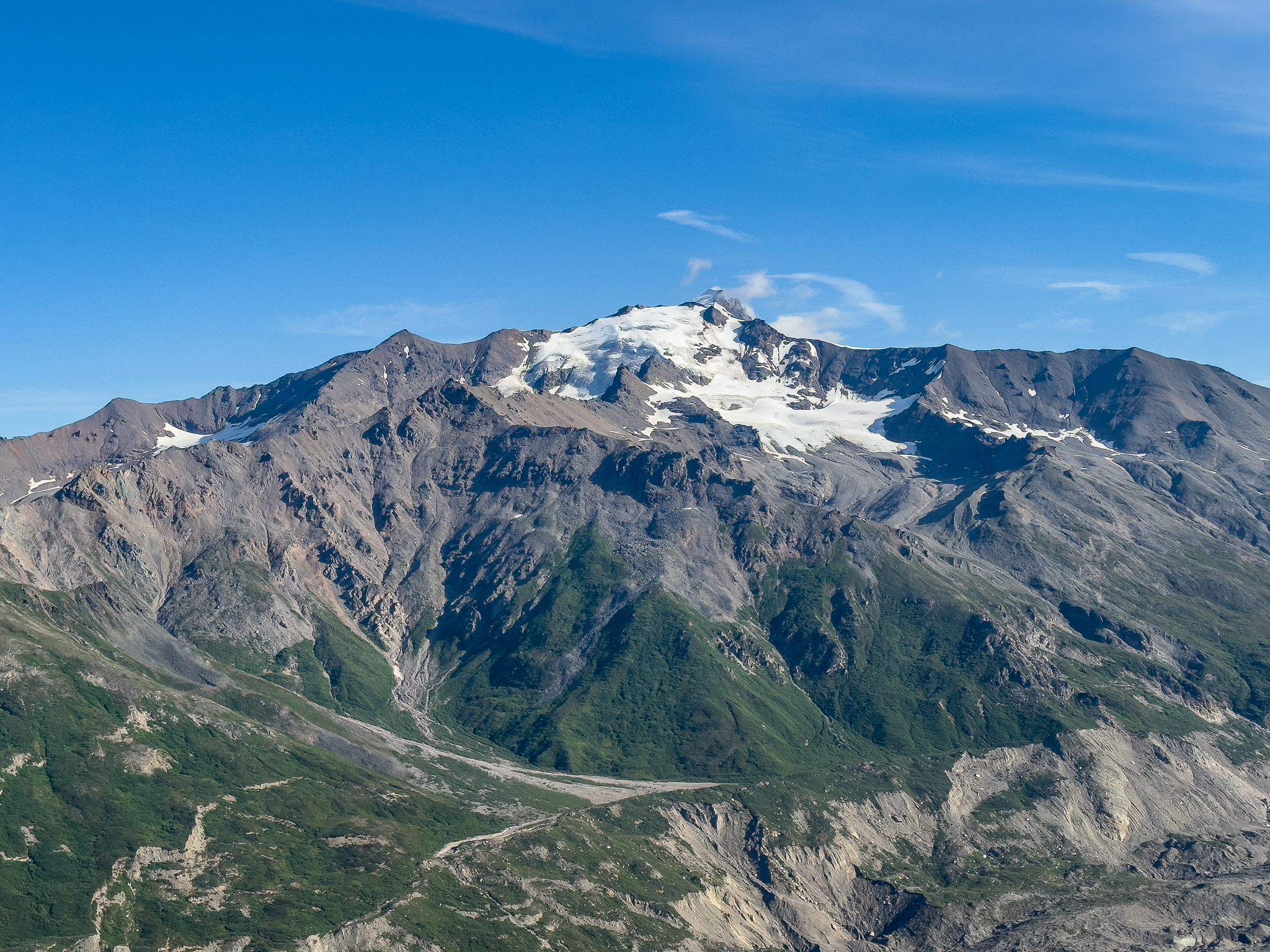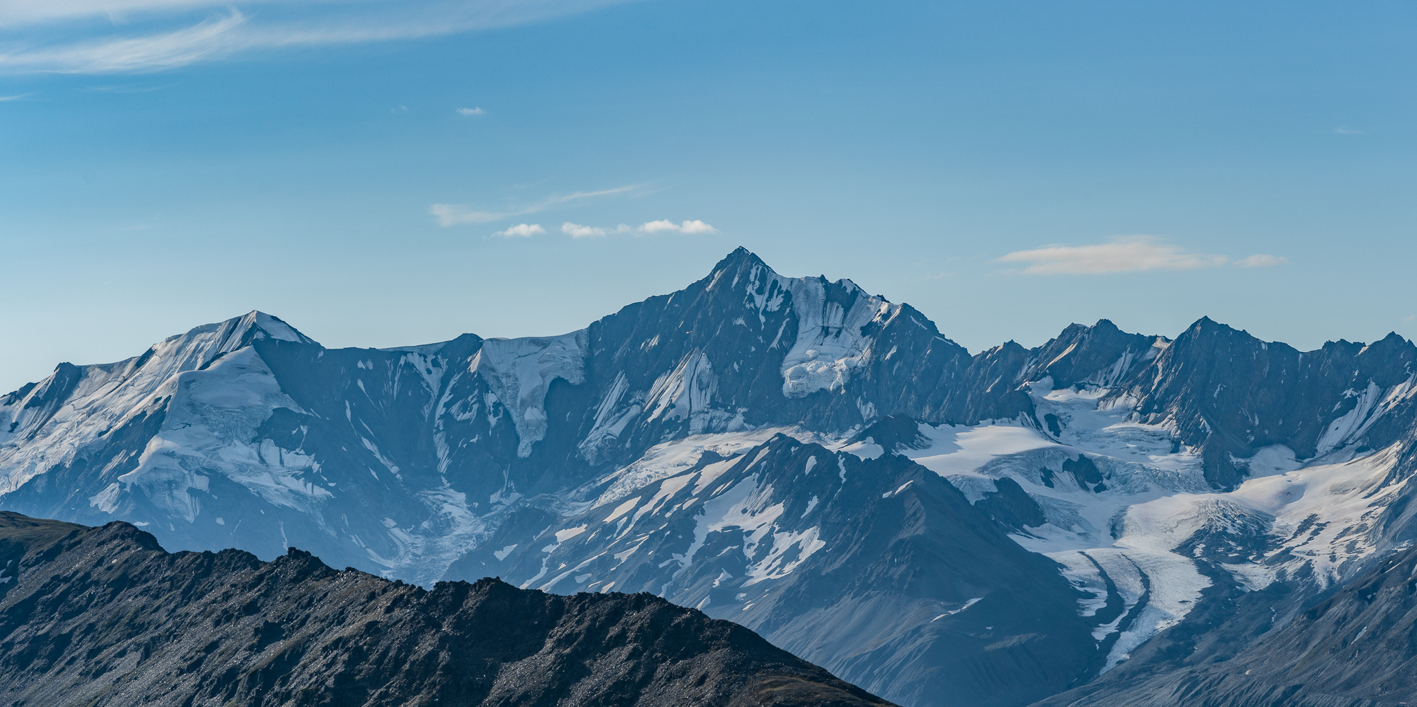 Finally, around 6:30PM the clouds on White Princess finally relented and gave me a view of the iconic summit fin. I actually whooped and did a little victory dance to the music in my ears. I was near my turnaround time and stopped to take more photos. The clouds were clearing off all the +9,000′ peaks, including White Princess, Silvertip, Blackcap, Little Princess, M’Ladies, and Double Exposure. FINALLY I got a view of the southwest icefall on White Princess, as well as the bare ice of the summit glacier feeding it. This was definitely the seasonal minimum of snow. Potentially an aberration; as it was a low-snow year for much of Alaska, this ice might not regularly be exposed even in late summer.