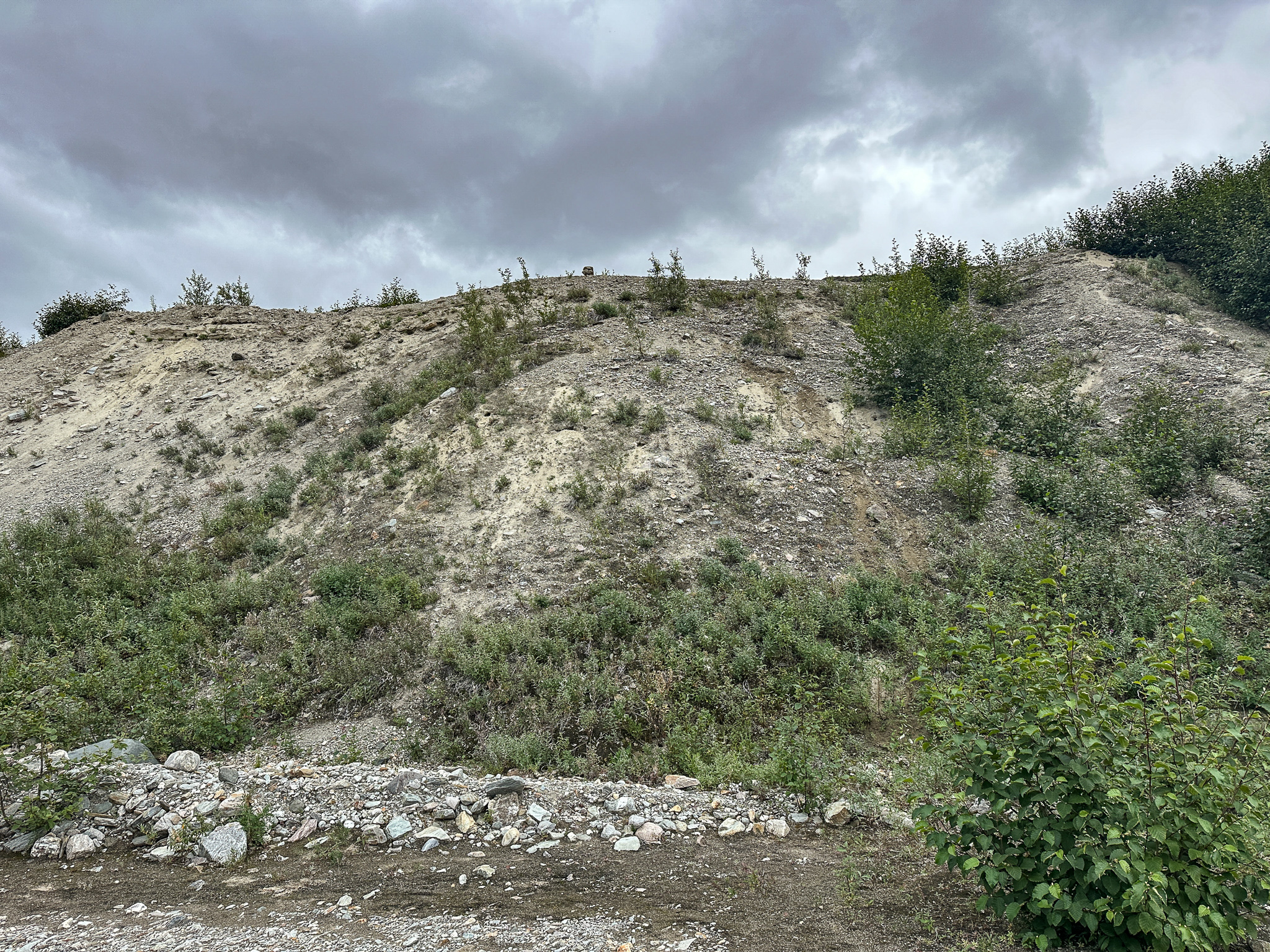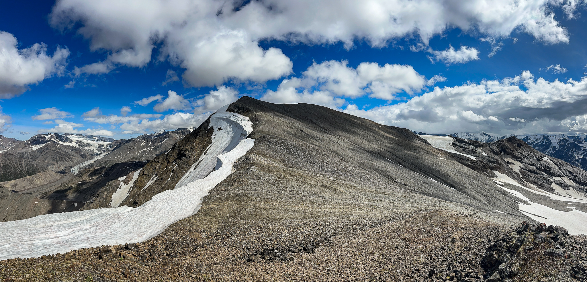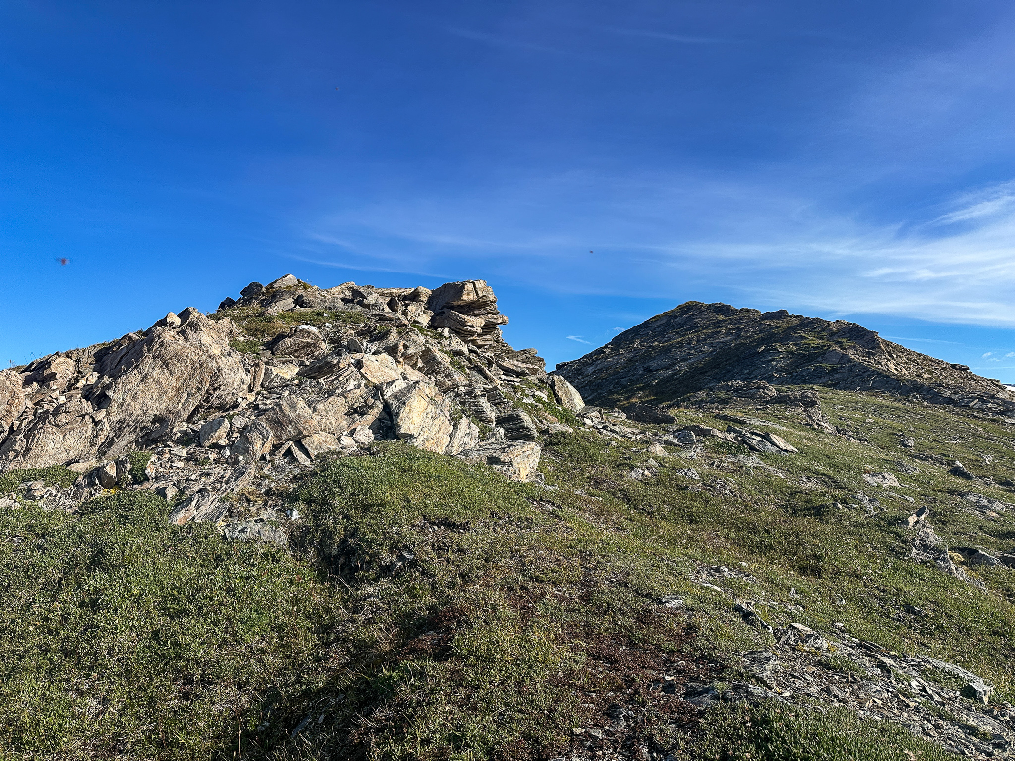 We had to lose some elevation after T3, dropping down to another remnant glacier at a col, just a smattering of ice filling a low point. There was some curious back rocks in one spot, we had no explanation form this formation. We hiked across the remnant glacier and back up the ridge towards the top of T2, which still had not come into view. I threw a few rocks onto the cornices next to us, hoping to cause a collapse, but they were far sturdier than snow had a right to be in late summer. As we climbed near the top of T2, we had the option of traversing below the peak or hiking the ridgeline to the top. We finally got a view of the summit from a few hundred feet away, it was not glaciated on our side so we decided to climb the ridge to the top. This section was not great climbing as all the glacial till was loose, but at least the scree was more solid than Chugach standards, likely due to the silt content.
