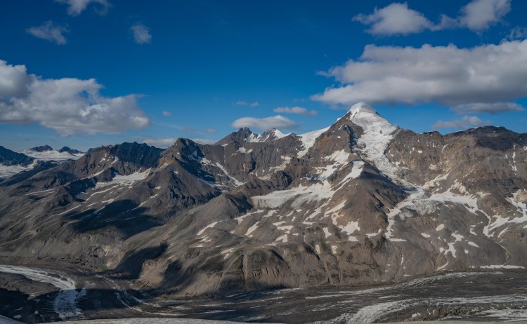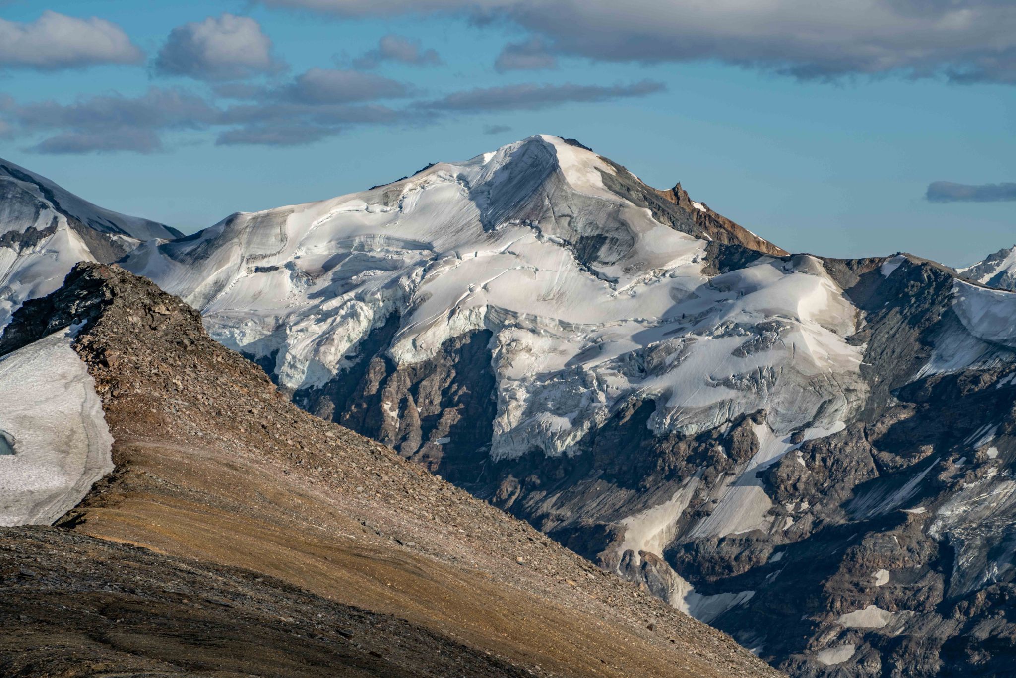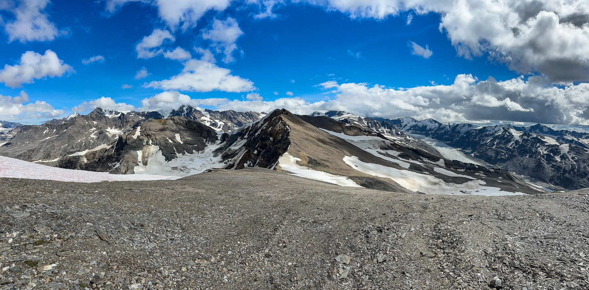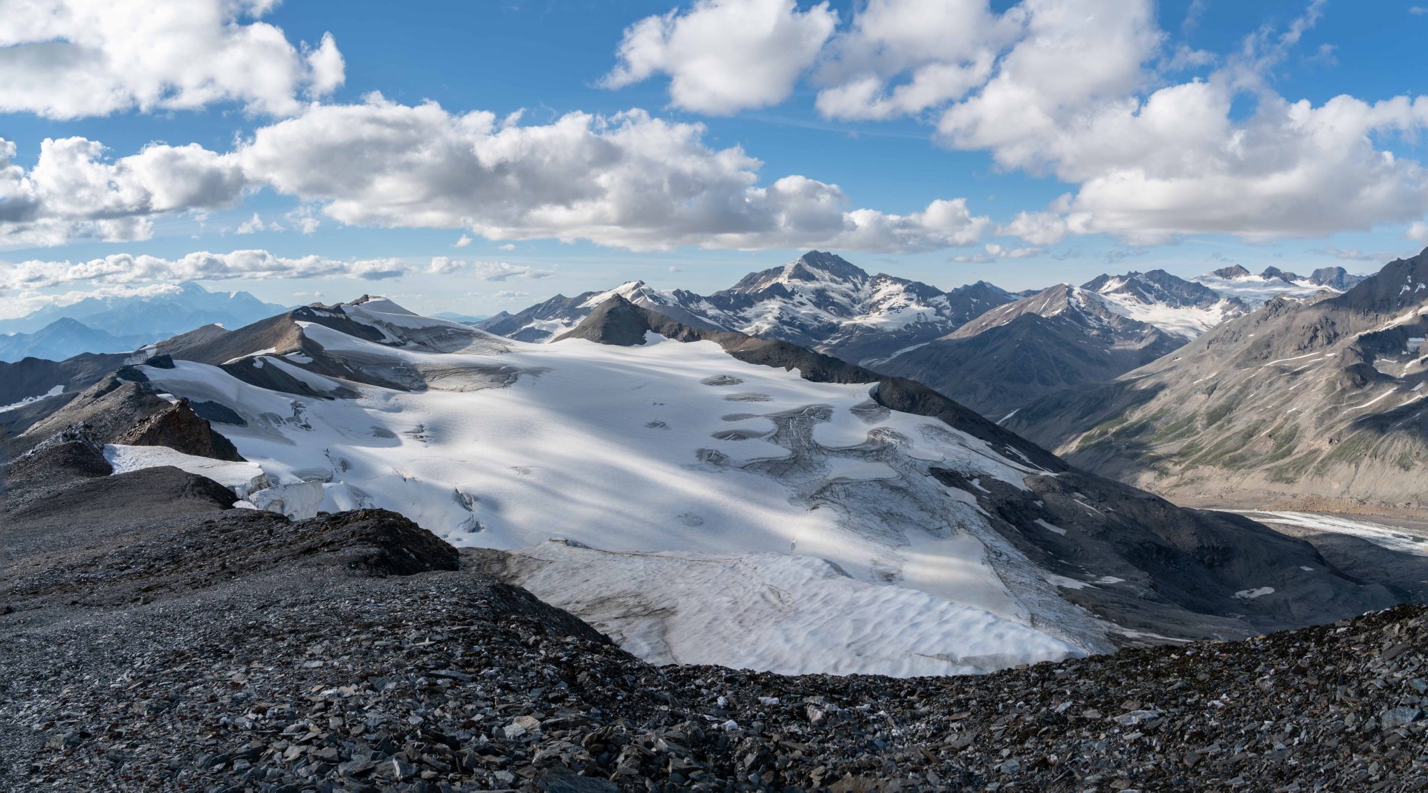 We had to lose some elevation after T3, dropping down to another remnant glacier at a col, just a smattering of ice filling a low point. There was some curious back rocks in one spot, we had no explanation form this formation. We hiked across the remnant glacier and back up the ridge towards the top of T2, which still had not come into view. I threw a few rocks onto the cornices next to us, hoping to cause a collapse, but they were far sturdier than snow had a right to be in late summer. As we climbed near the top of T2, we had the option of traversing below the peak or hiking the ridgeline to the top. We finally got a view of the summit from a few hundred feet away, it was not glaciated on our side so we decided to climb the ridge to the top. This section was not great climbing as all the glacial till was loose, but at least the scree was more solid than Chugach standards, likely due to the silt content.