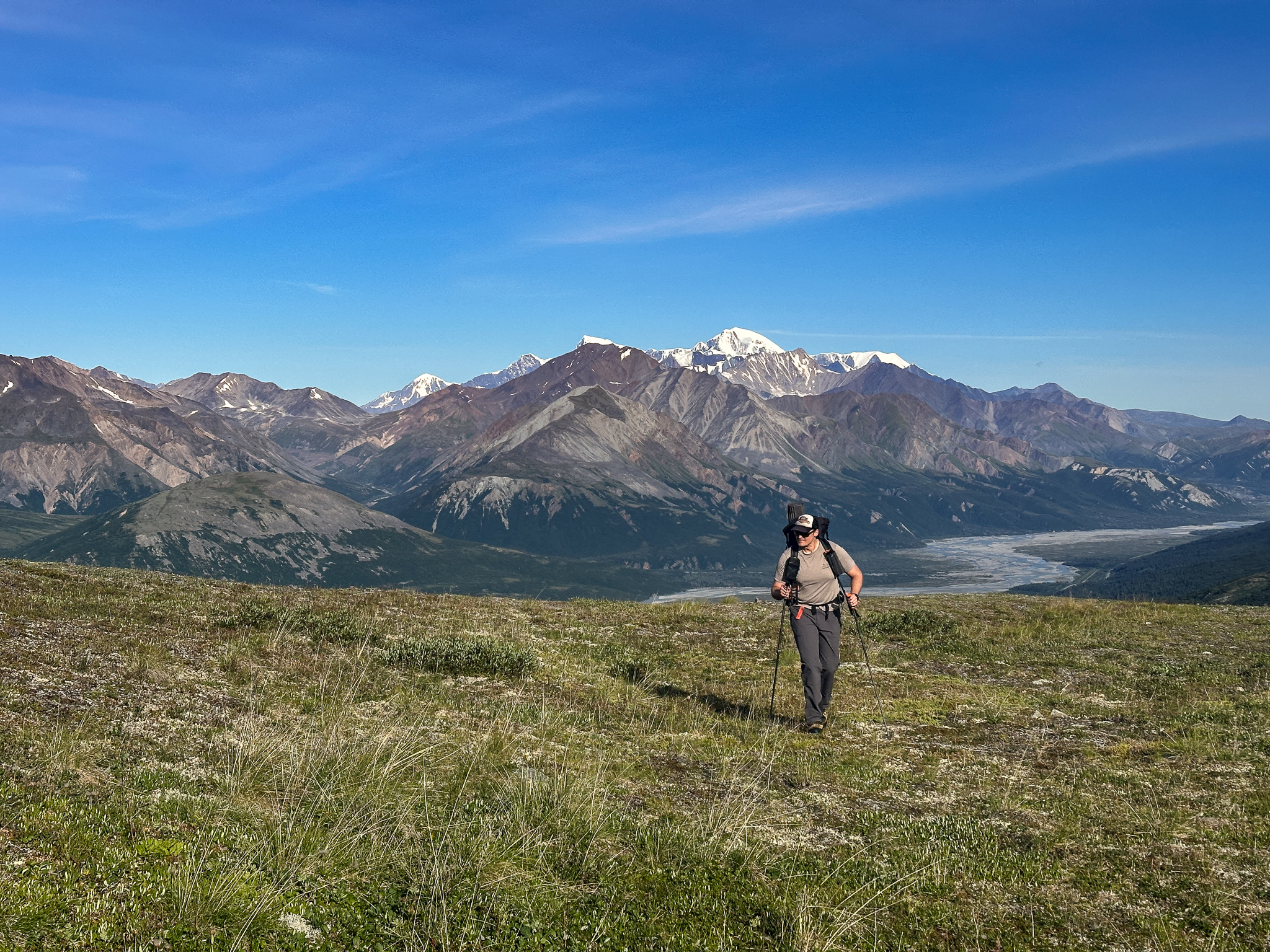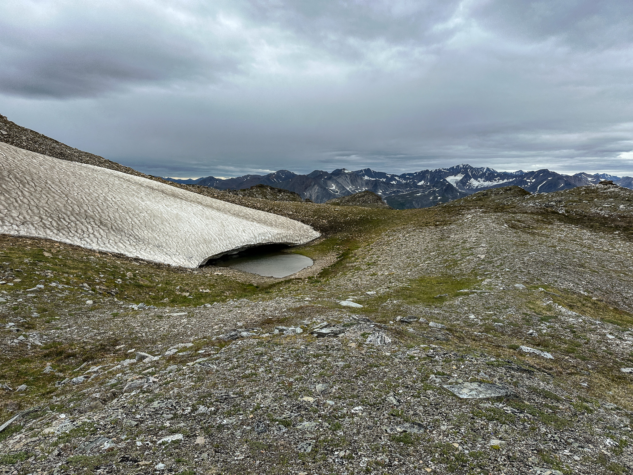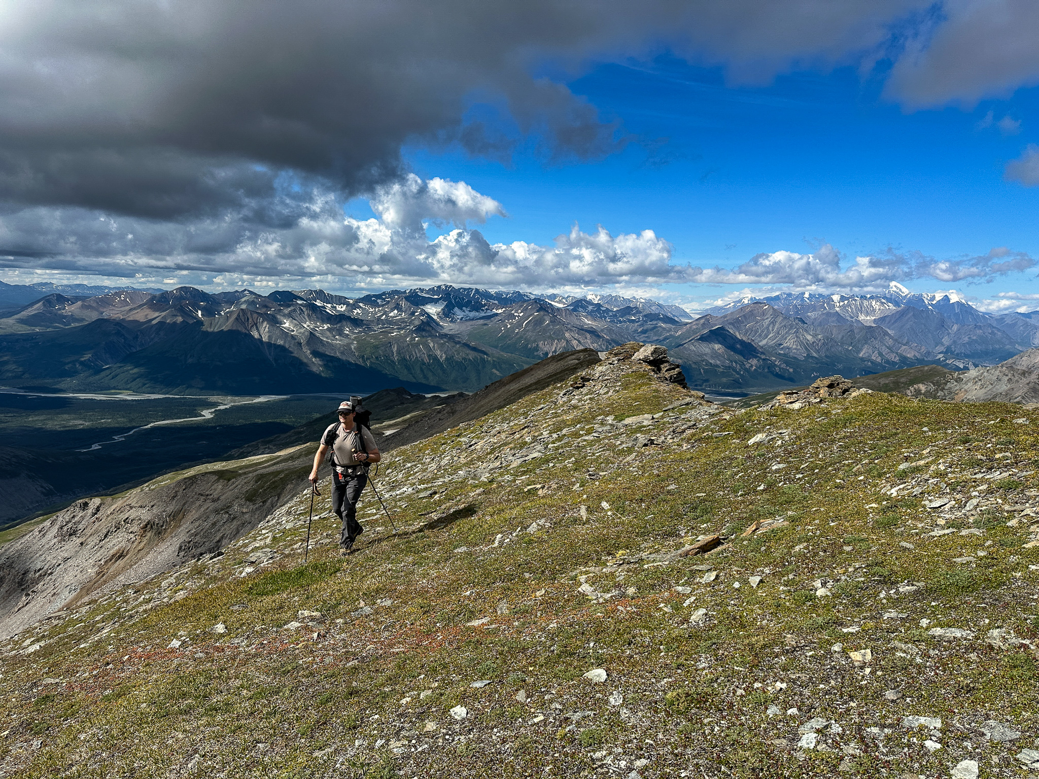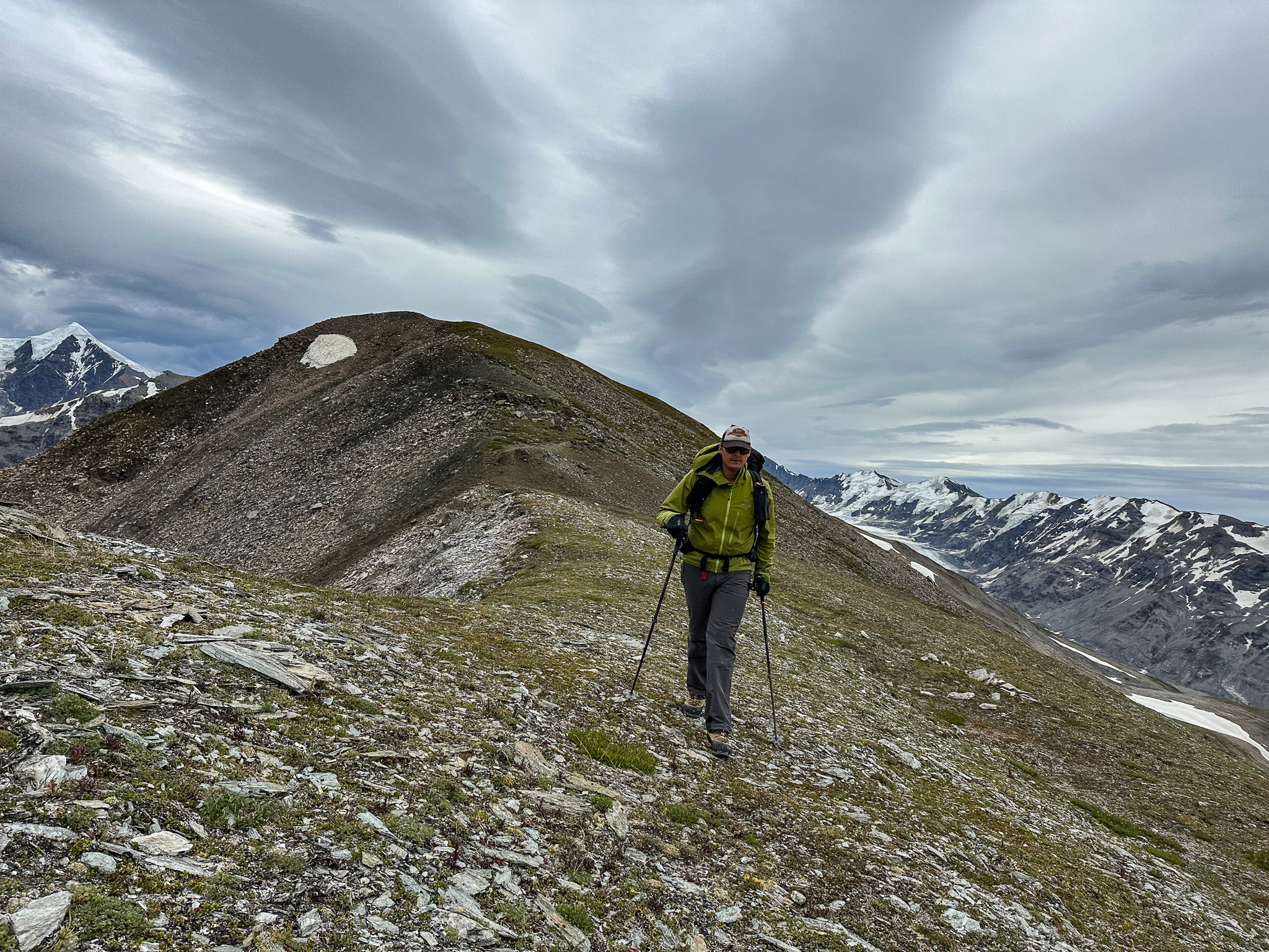 “This is easy schwacking, there’s not even spiky plants!” We mocked the brittle willows as we snapped through the foliage that obscured our path, but still it would have been nice to have a trail. Eventually, we found the trail and the rest of the ascent was a breeze. We de-layered when we reached the rocks above the treeline and left our unused saws and Grant’s bush gloves in the alpine by a bush. We had optimistically thought we might contribute to the trail, but our help was unnecessary. We hiked upwards, gaining the steep initial ascent to 4,800′ in good time, passing the spot I had camped 5 years ago and continuing upwards. At this point there was little wind and each of us had our own cloud of bugs. A few miles to the south two F-35s screamed past us, cruising east up the Canwell Glacier at speeds over 500mph and less than a mile off the ground. I reached the false summit first and saw two sheep that scurried further up the ridge. Grant joined me shortly after and we took a break, letting our clouds of bugs intermingle.