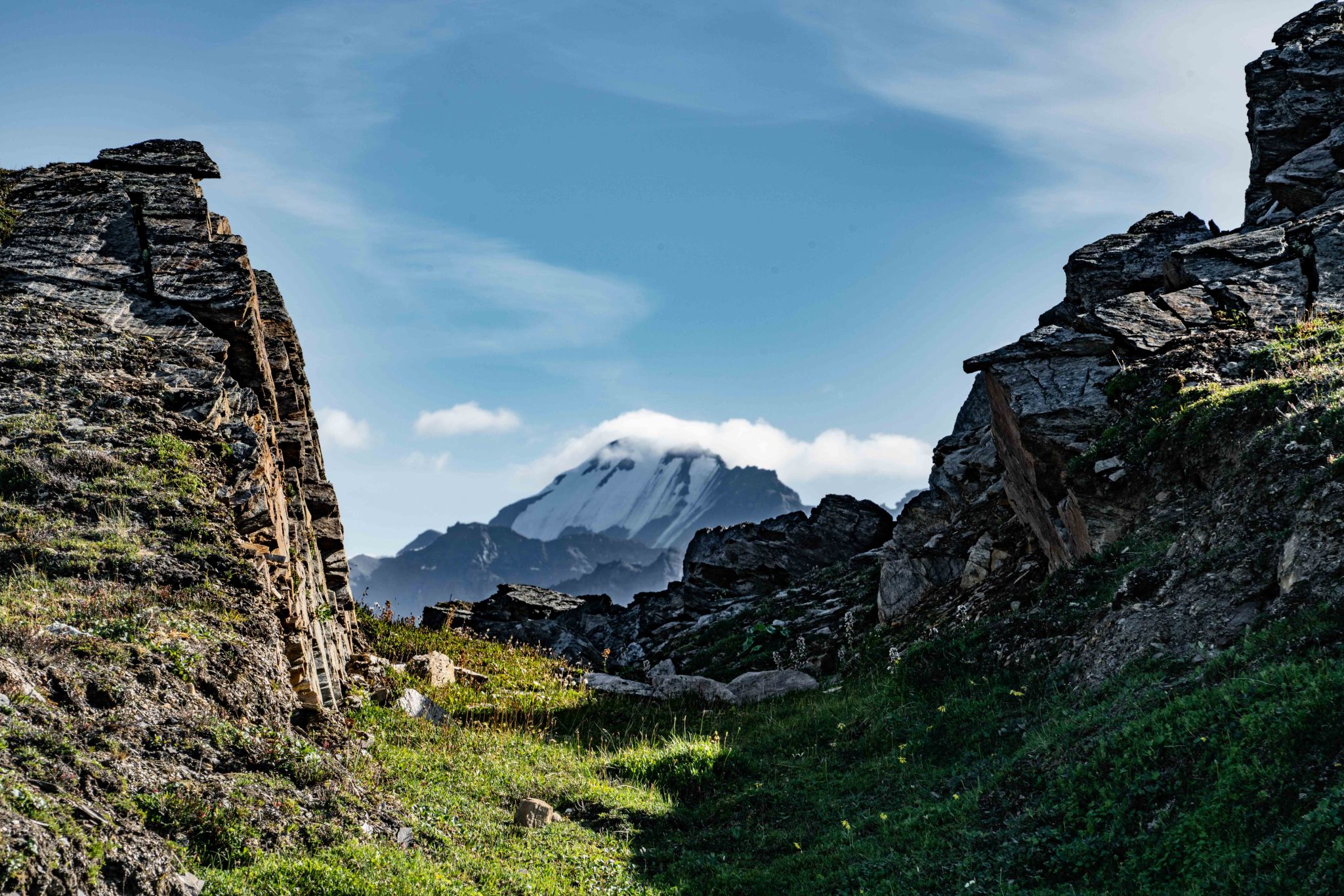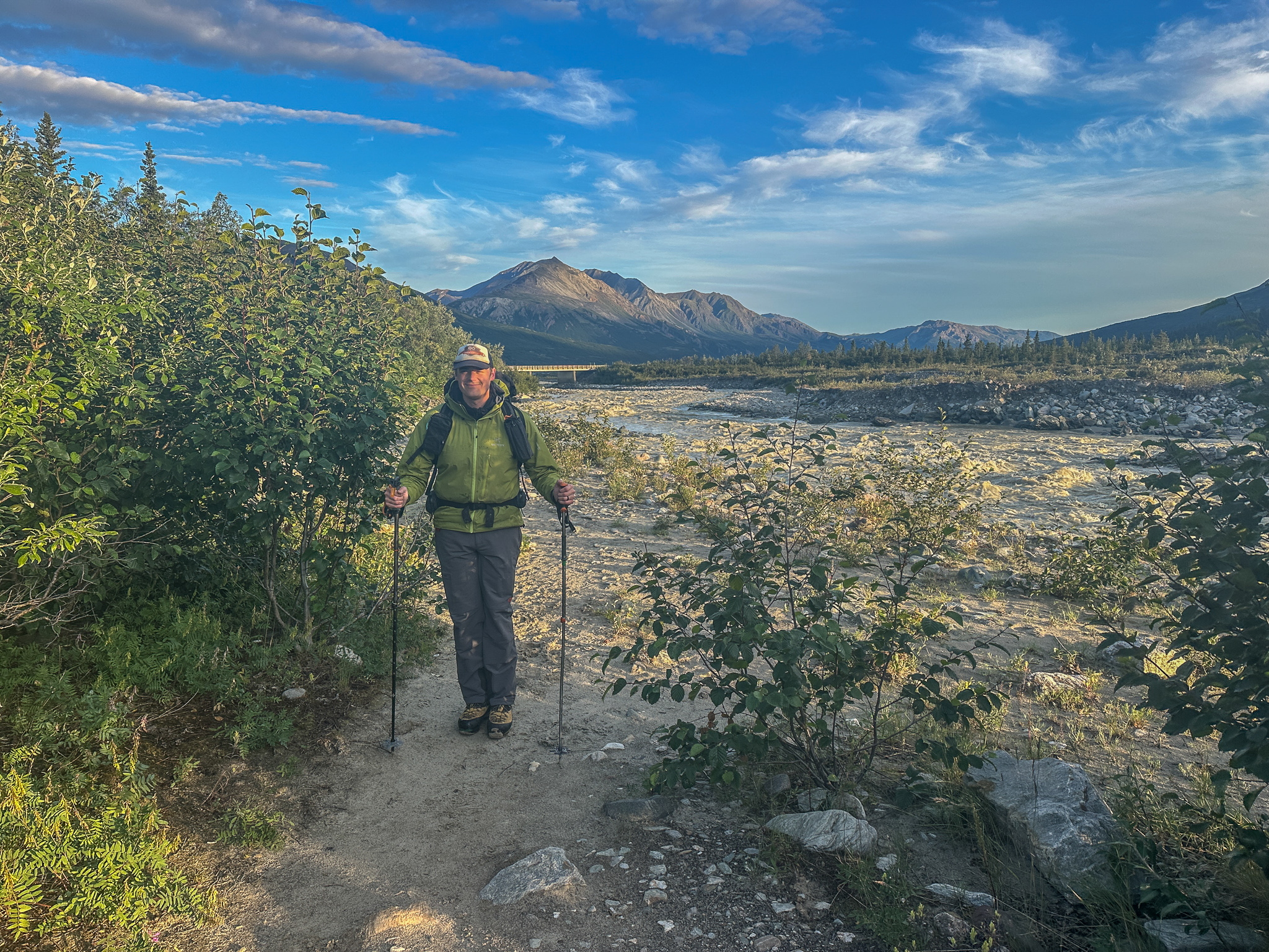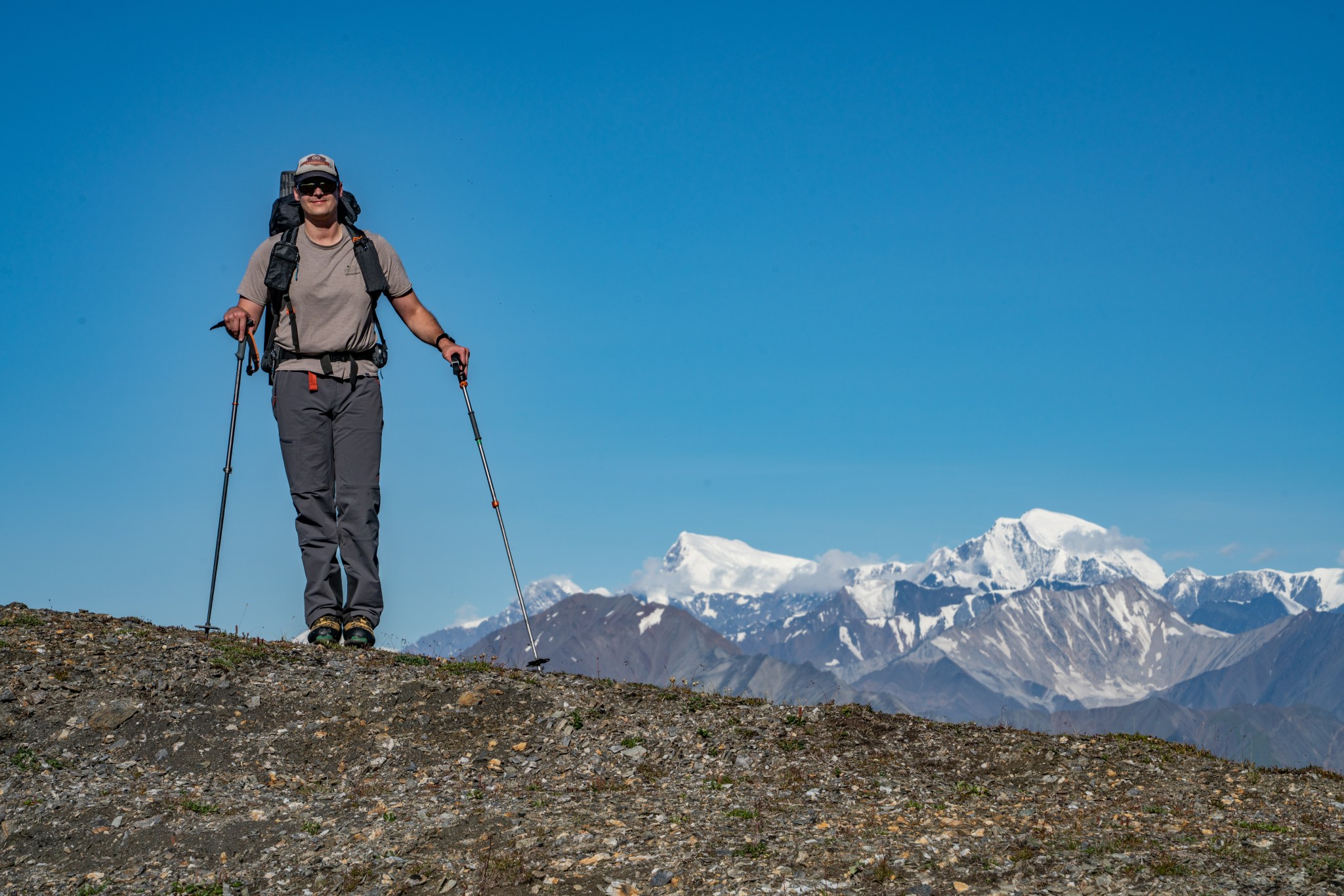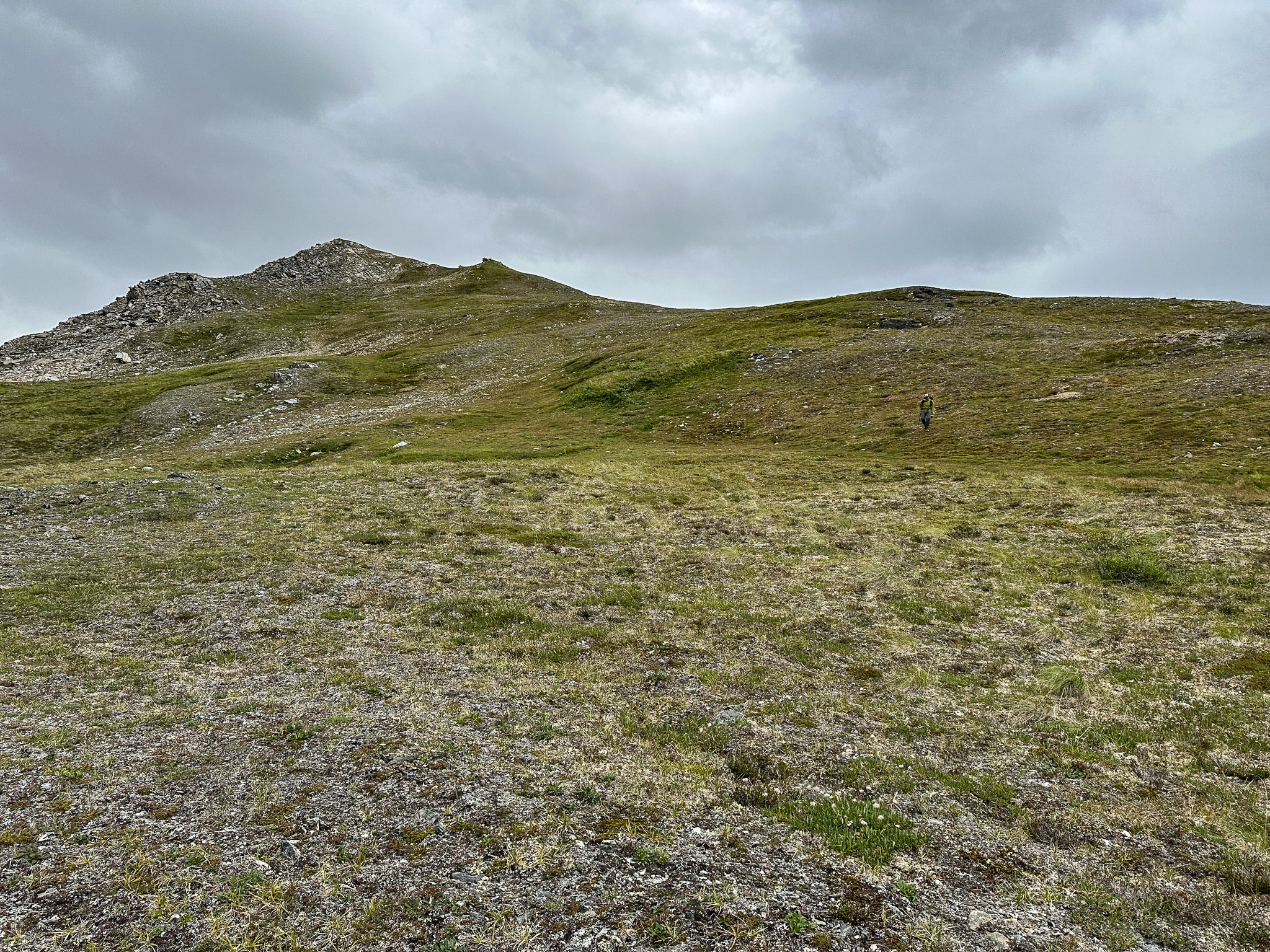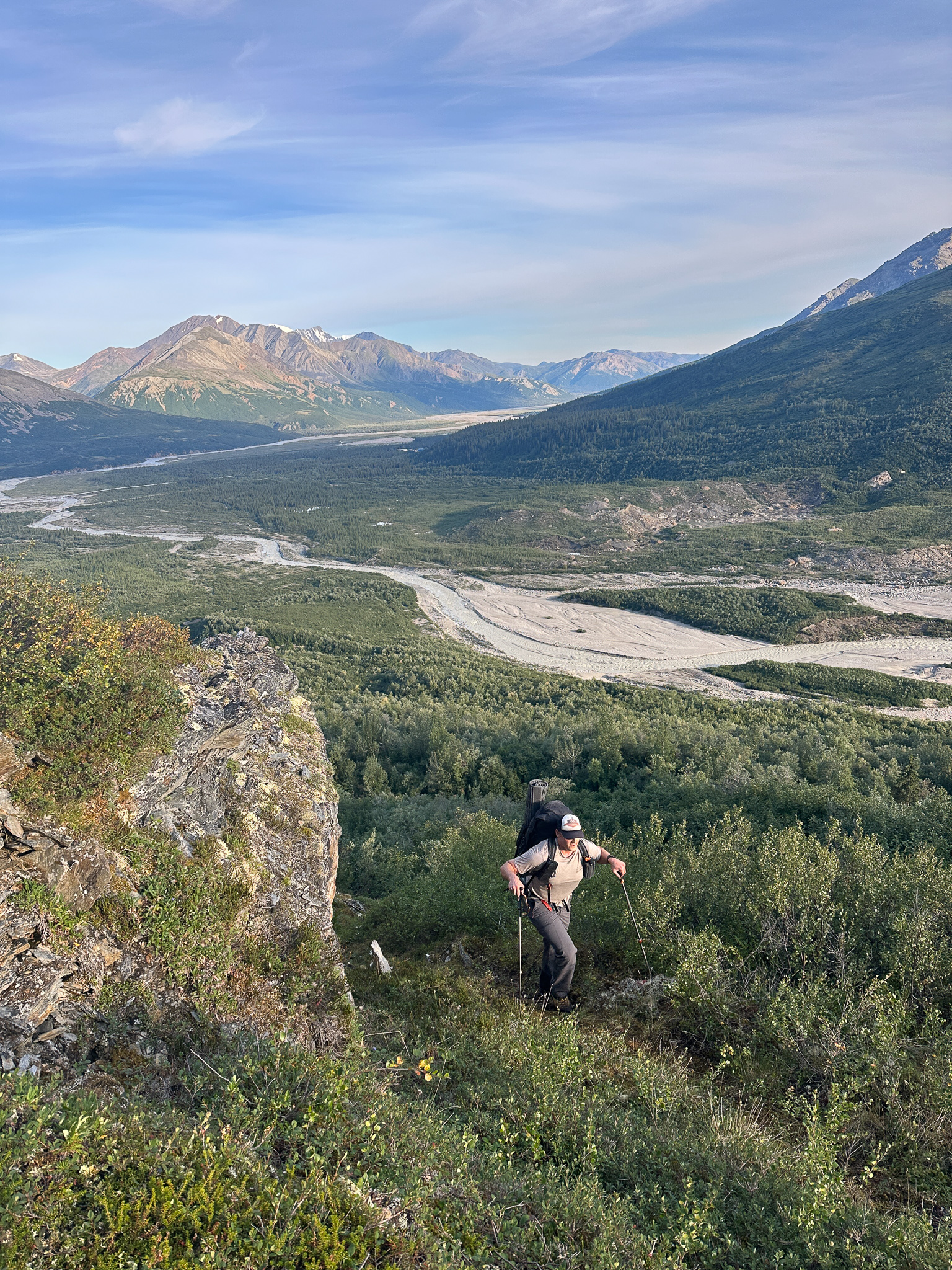 “This is easy schwacking, there’s not even spiky plants!” We mocked the brittle willows as we snapped through the foliage that obscured our path, but still it would have been nice to have a trail. Eventually, we found the trail and the rest of the ascent was a breeze. We de-layered when we reached the rocks above the treeline and left our unused saws and Grant’s bush gloves in the alpine by a bush. We had optimistically thought we might contribute to the trail, but our help was unnecessary. We hiked upwards, gaining the steep initial ascent to 4,800′ in good time, passing the spot I had camped 5 years ago and continuing upwards. At this point there was little wind and each of us had our own cloud of bugs. A few miles to the south two F-35s screamed past us, cruising east up the Canwell Glacier at speeds over 500mph and less than a mile off the ground. I reached the false summit first and saw two sheep that scurried further up the ridge. Grant joined me shortly after and we took a break, letting our clouds of bugs intermingle.