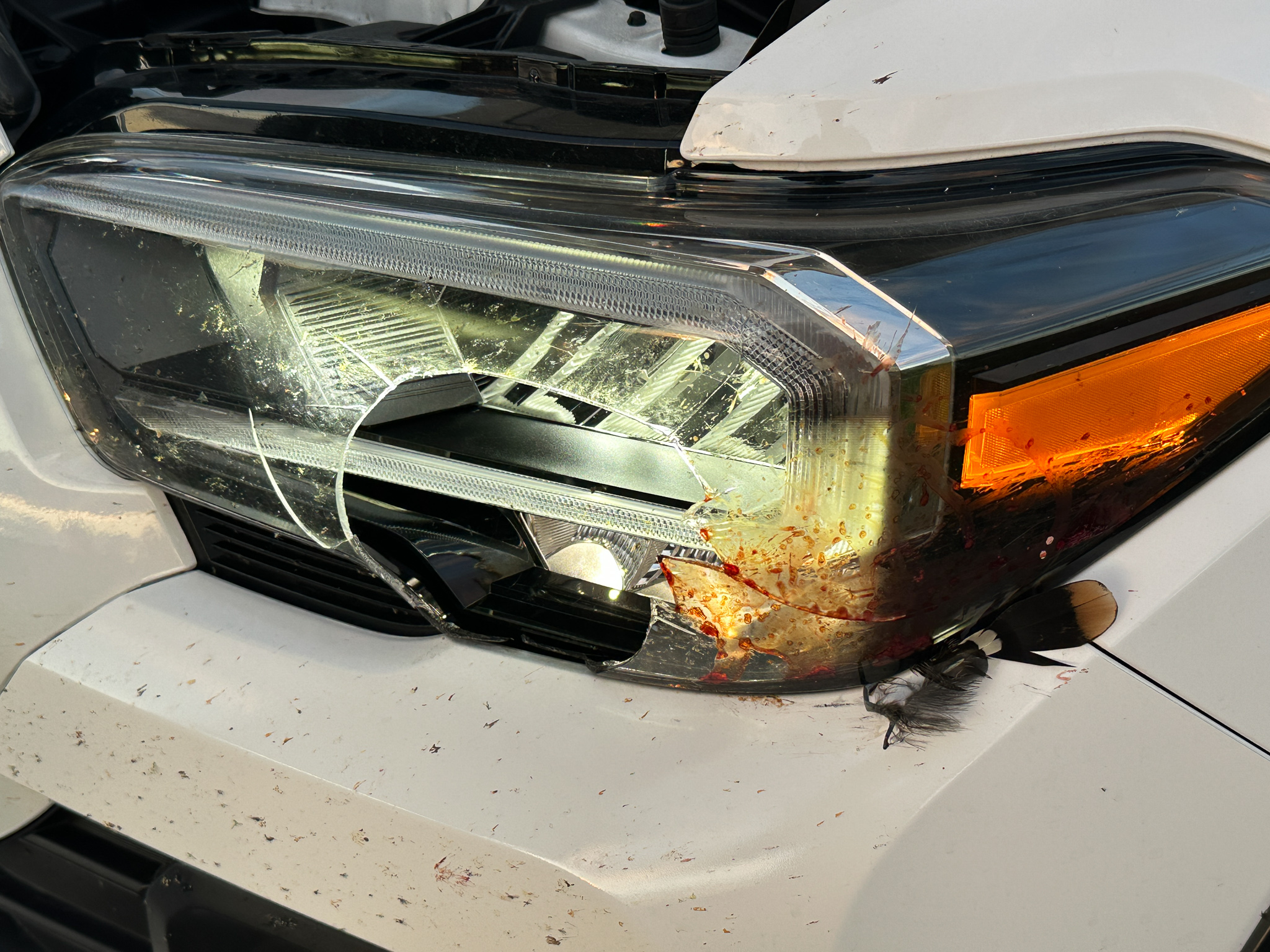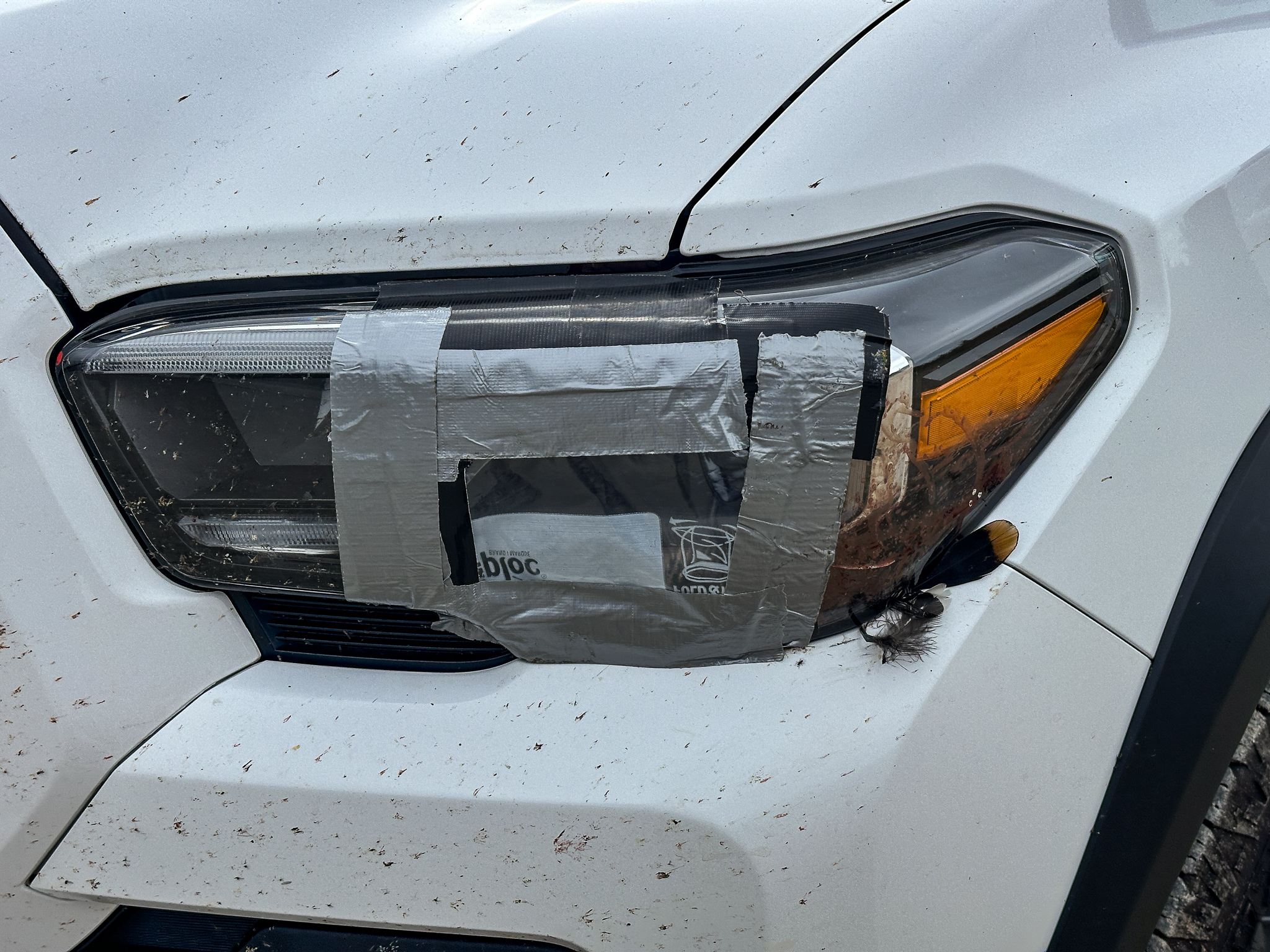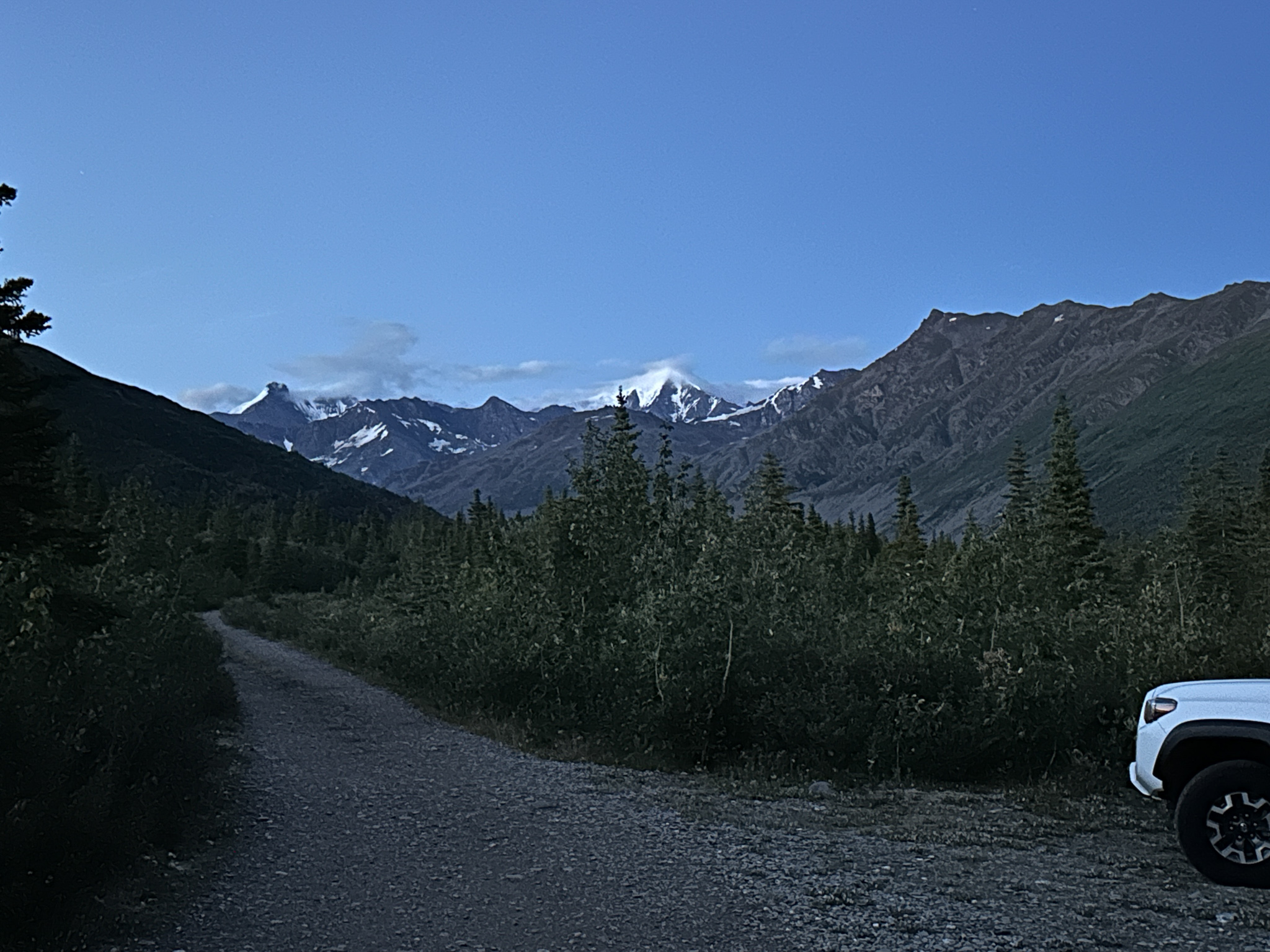 Grant and I thought we had a weather window the first few days of August and requested time off from work, but the weather window slammed shut the morning we were to depart. We were both bummed but had no desire to explore a 7,000′ ridge with a cloud ceiling of 3,000′. The spectacular views were kind of the whole point of the trip. However, as we were drinking mango mimosas on our friends’ deck a few days later, we saw the following week’s forecast had one solid day of high pressure in a two day gap between storms. With a better forecast, I talked Grant into taking two days off work again. I picked him up from his new house after work on August 5th and we drove 5.5 hours to the Castner River. A ptarmigan committed suicide an hour south of the Castner by flying into my driver’s side headlight, breaking the glass cover. The light still worked, so we finished driving at dusk and darkness fell around us as we made camp in the familiar woods.