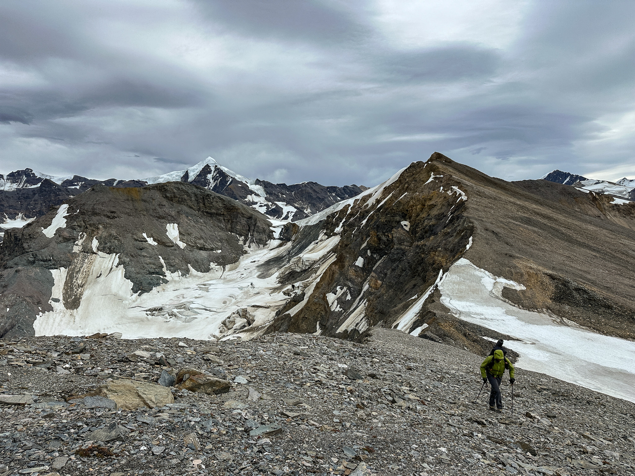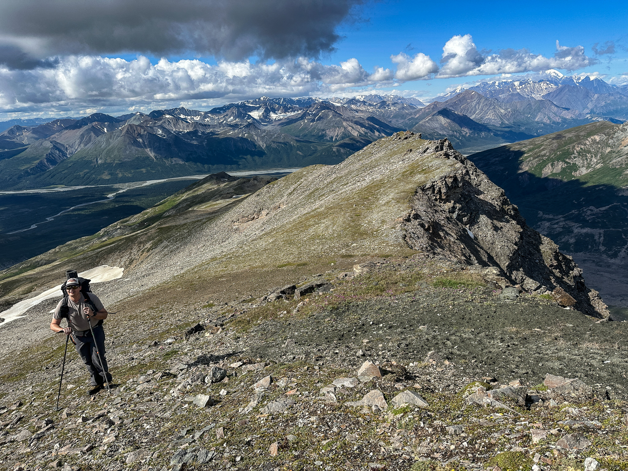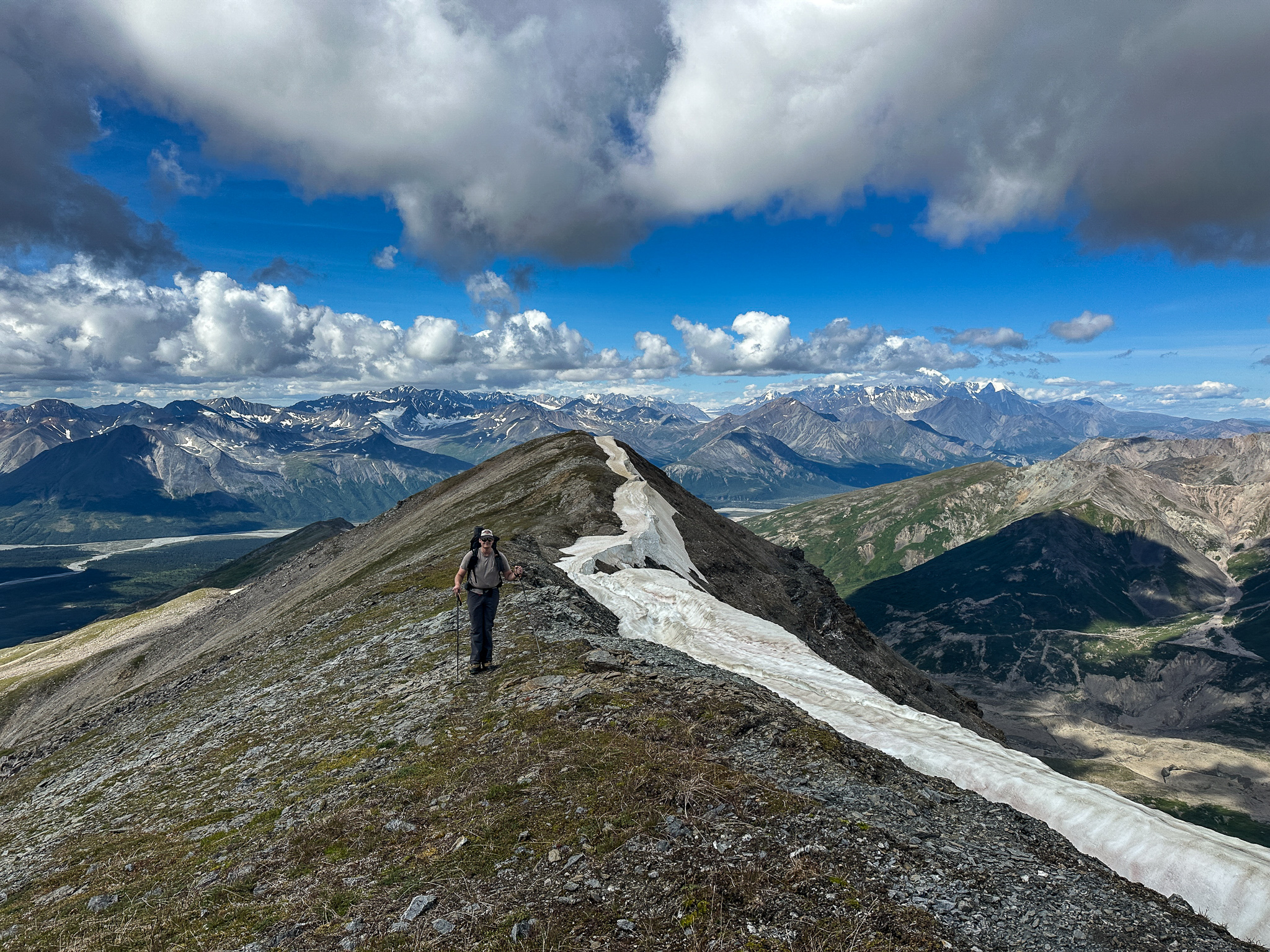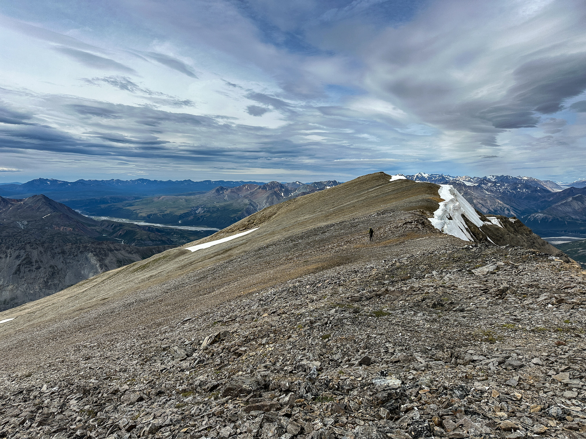 I topped out on T2 and found the far side of the peak distinctly snowy, immediately becoming a glacier. This…was different. Google and ESRI imagery showed this, but it was hard to imagine what a “somewhat glaciated” summit would entail. I encouraged Grant to top out with me and check out the landscape, after which we followed the ridgeline deeper into the mountains paralleling the M’Ladies Branch of the Castner Glacier. Grant’s feet were blistering, he didn’t have much appetite for more hiking and wanted to make camp.