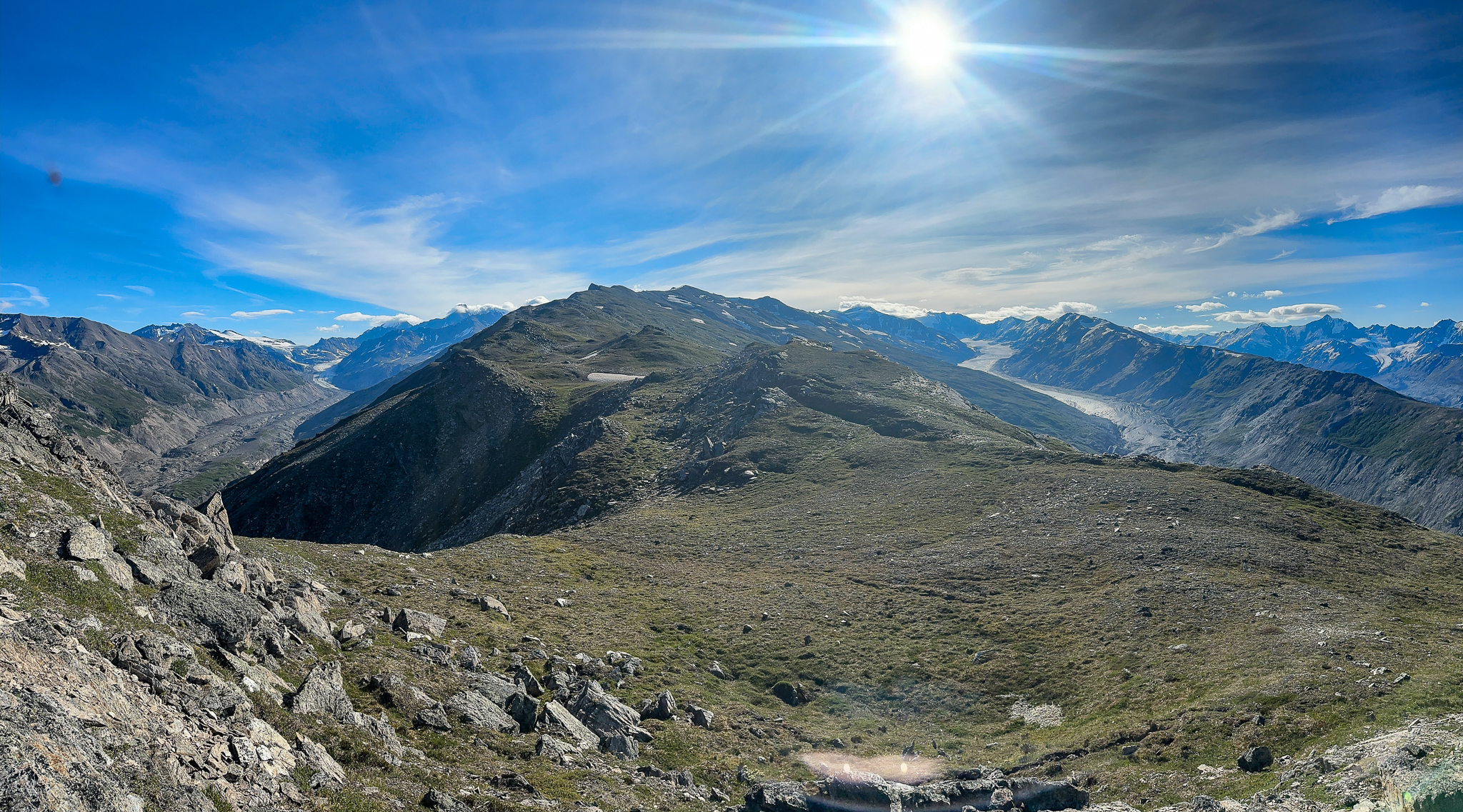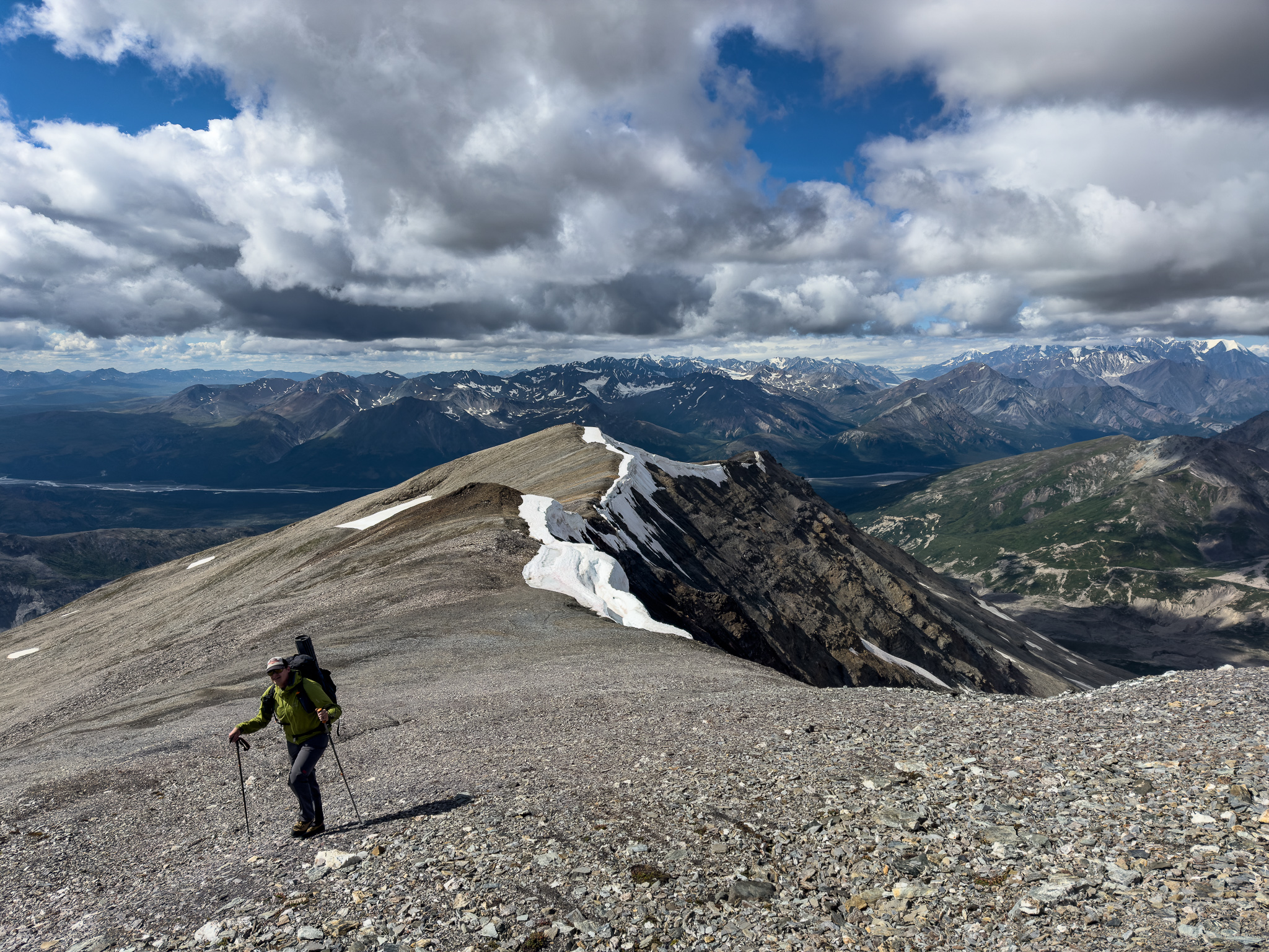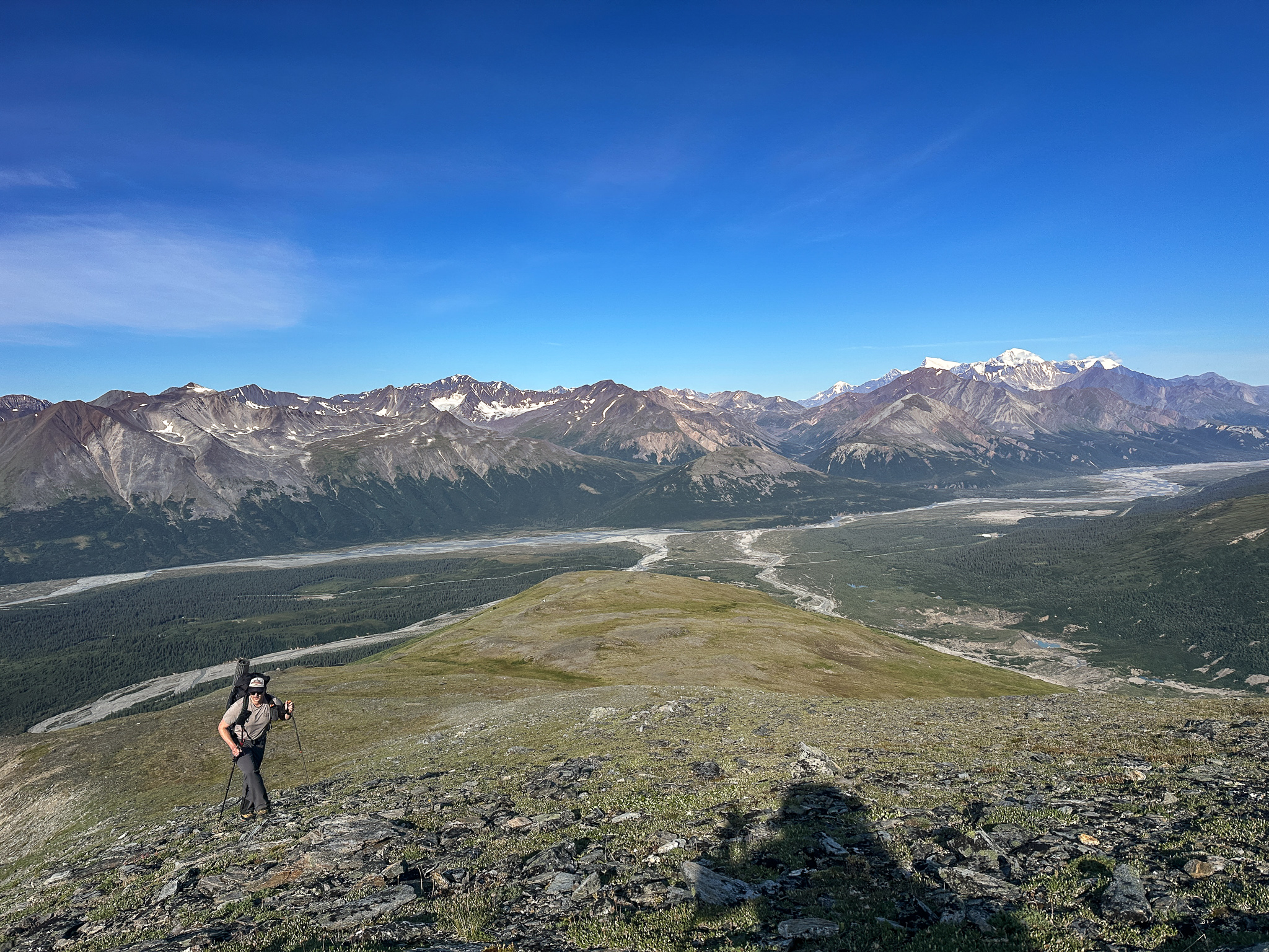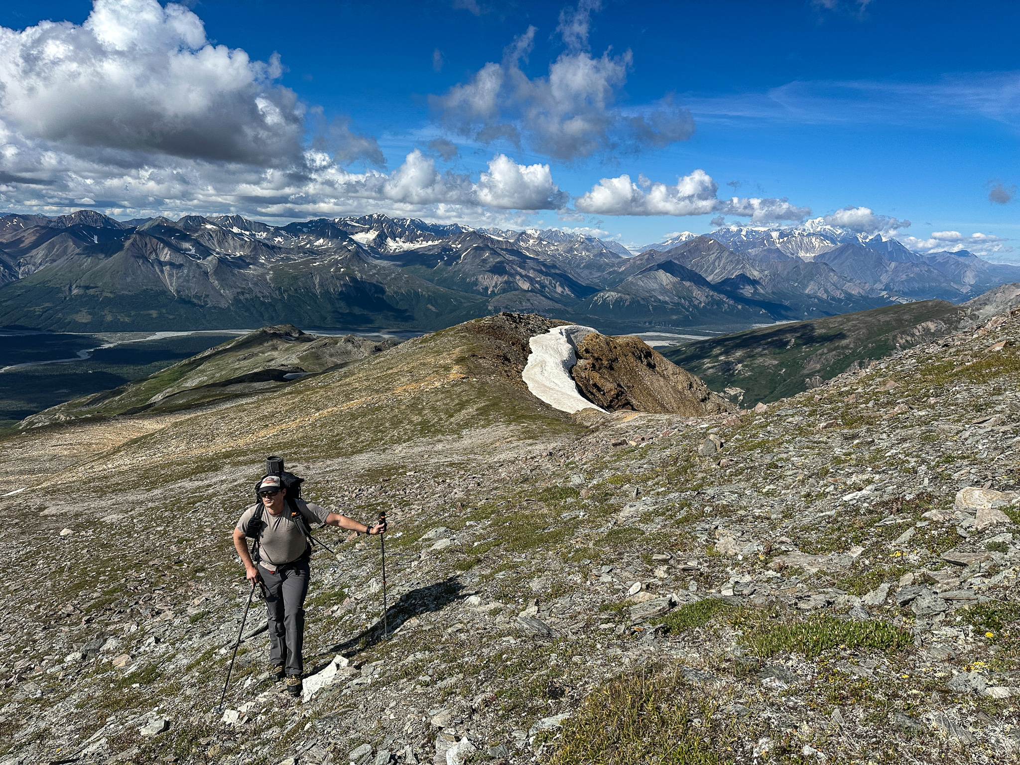 I topped out on T2 and found the far side of the peak distinctly snowy, immediately becoming a glacier. This…was different. Google and ESRI imagery showed this, but it was hard to imagine what a “somewhat glaciated” summit would entail. I encouraged Grant to top out with me and check out the landscape, after which we followed the ridgeline deeper into the mountains paralleling the M’Ladies Branch of the Castner Glacier. Grant’s feet were blistering, he didn’t have much appetite for more hiking and wanted to make camp.