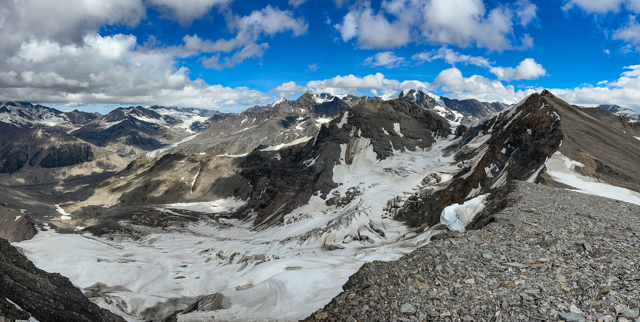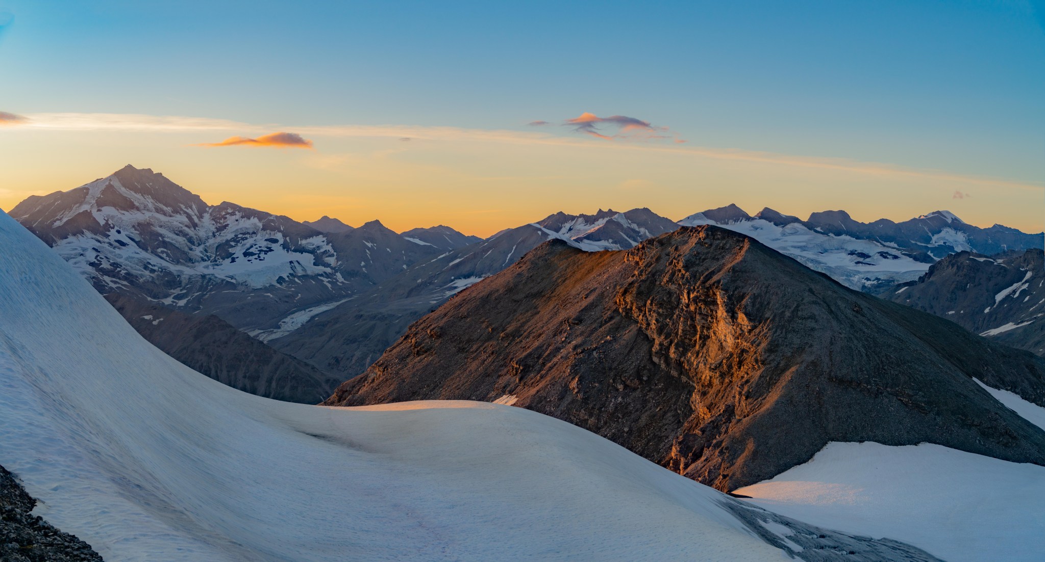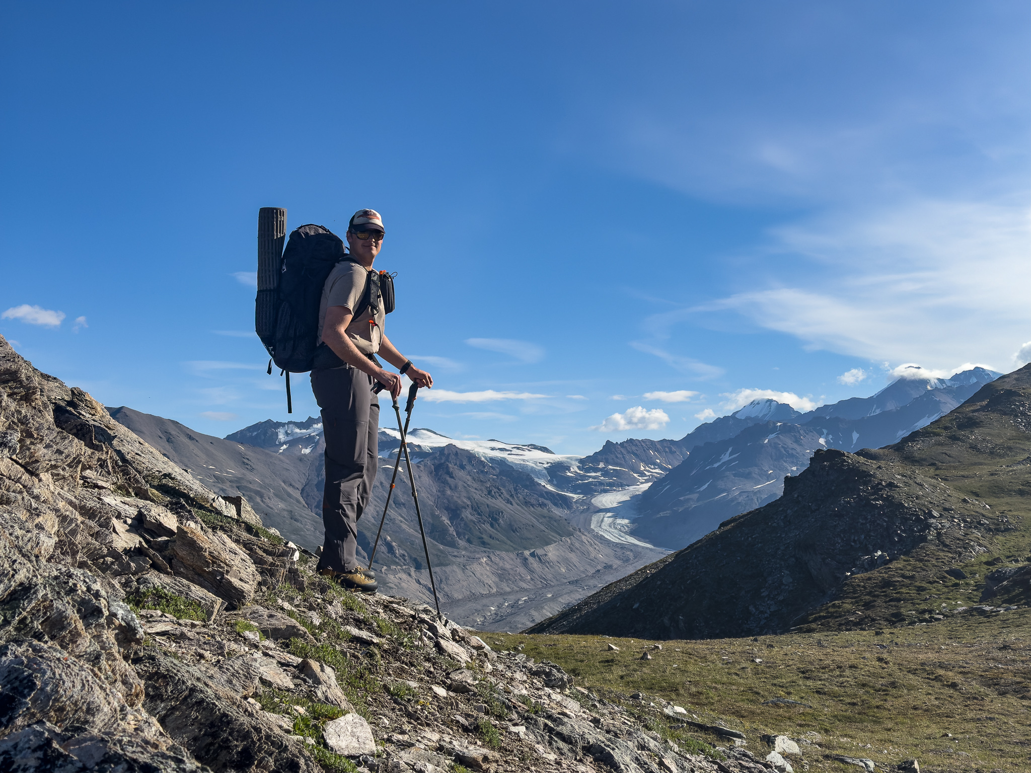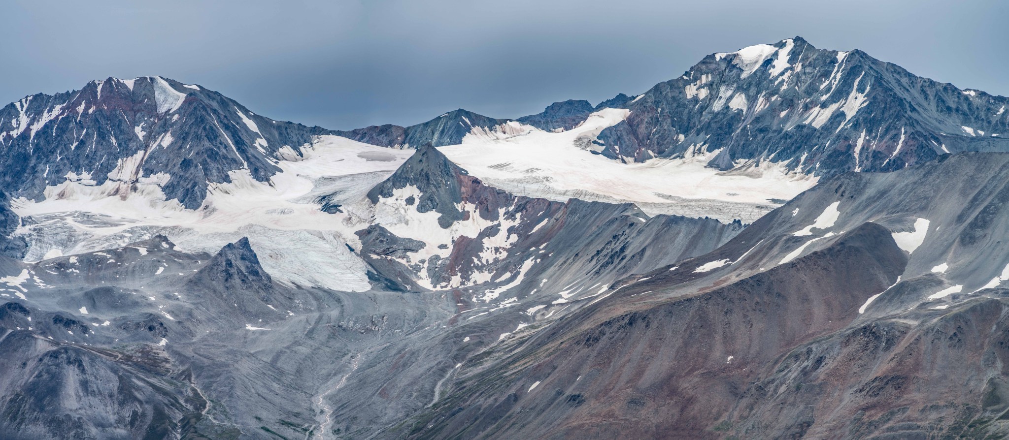 I topped out on T2 and found the far side of the peak distinctly snowy, immediately becoming a glacier. This…was different. Google and ESRI imagery showed this, but it was hard to imagine what a “somewhat glaciated” summit would entail. I encouraged Grant to top out with me and check out the landscape, after which we followed the ridgeline deeper into the mountains paralleling the M’Ladies Branch of the Castner Glacier. Grant’s feet were blistering, he didn’t have much appetite for more hiking and wanted to make camp.