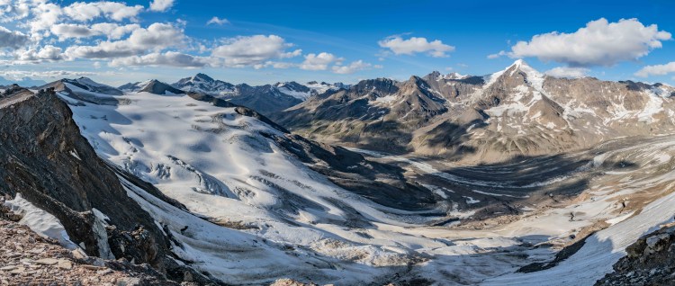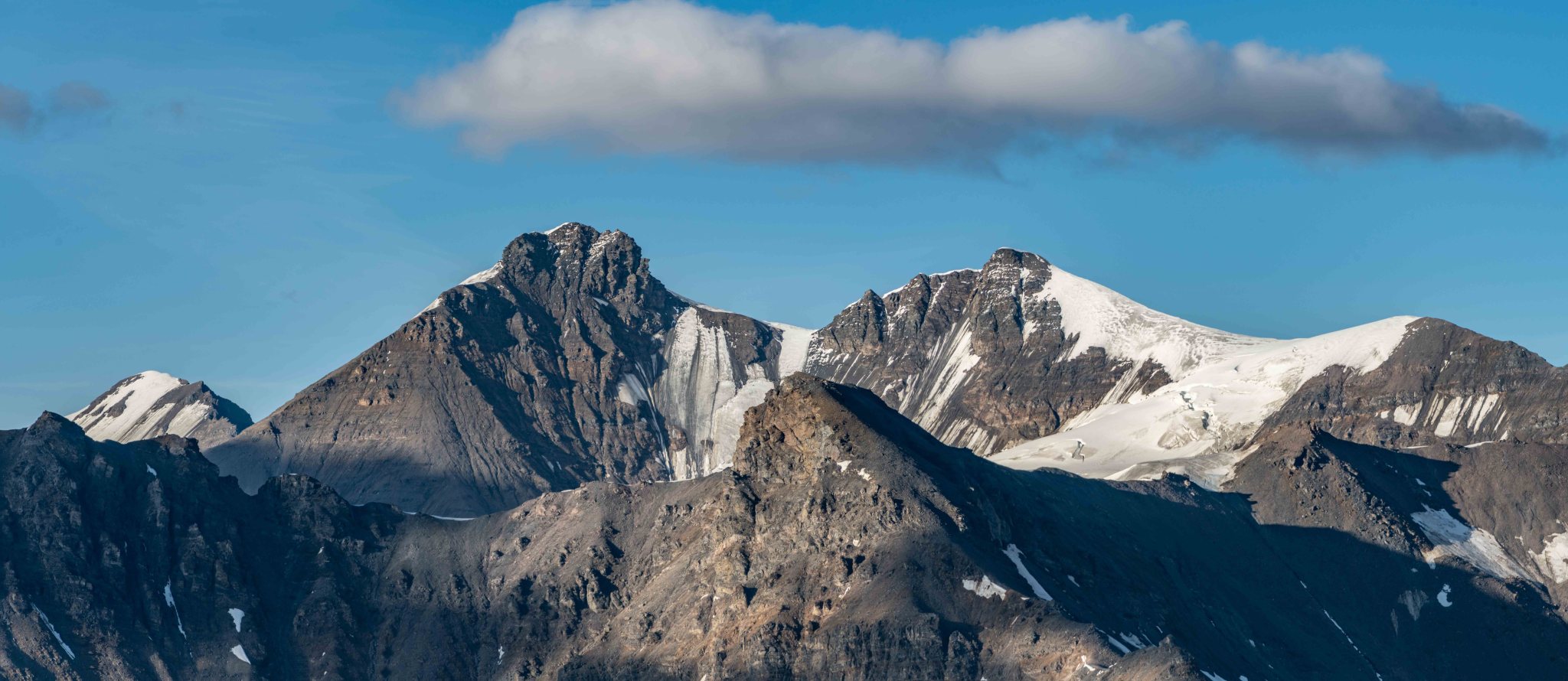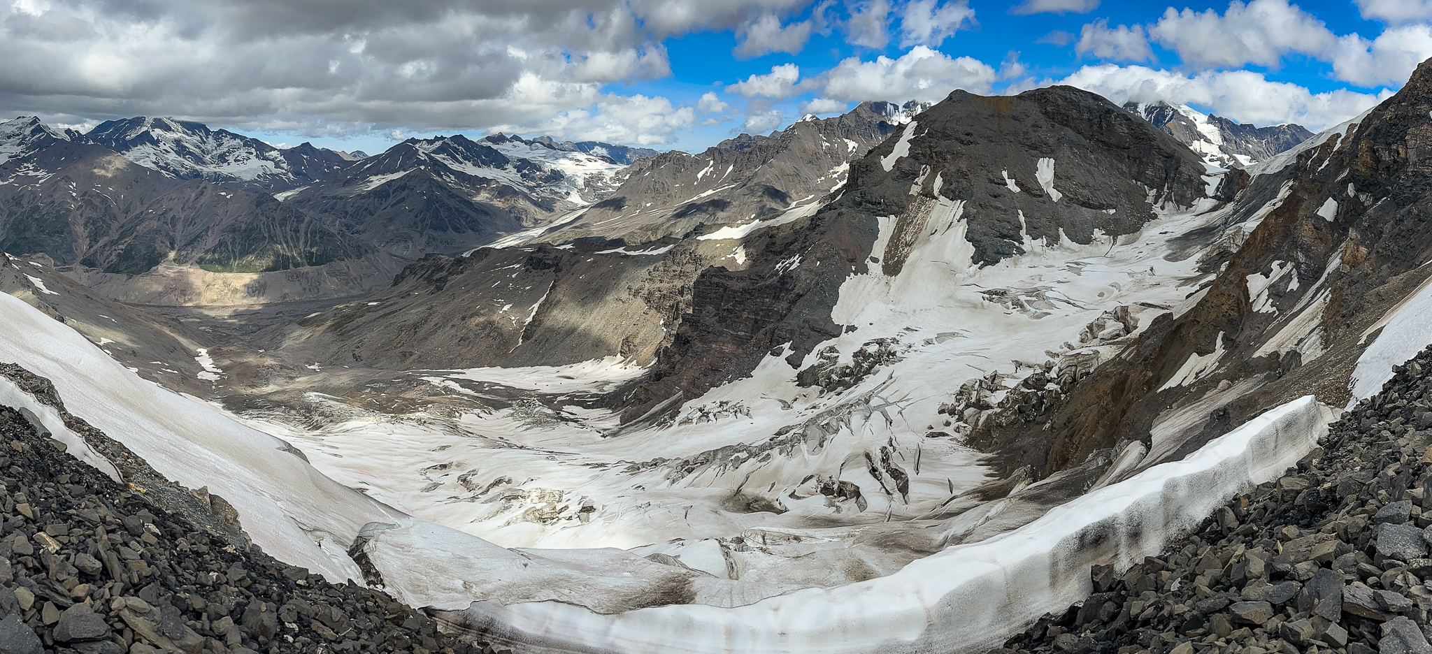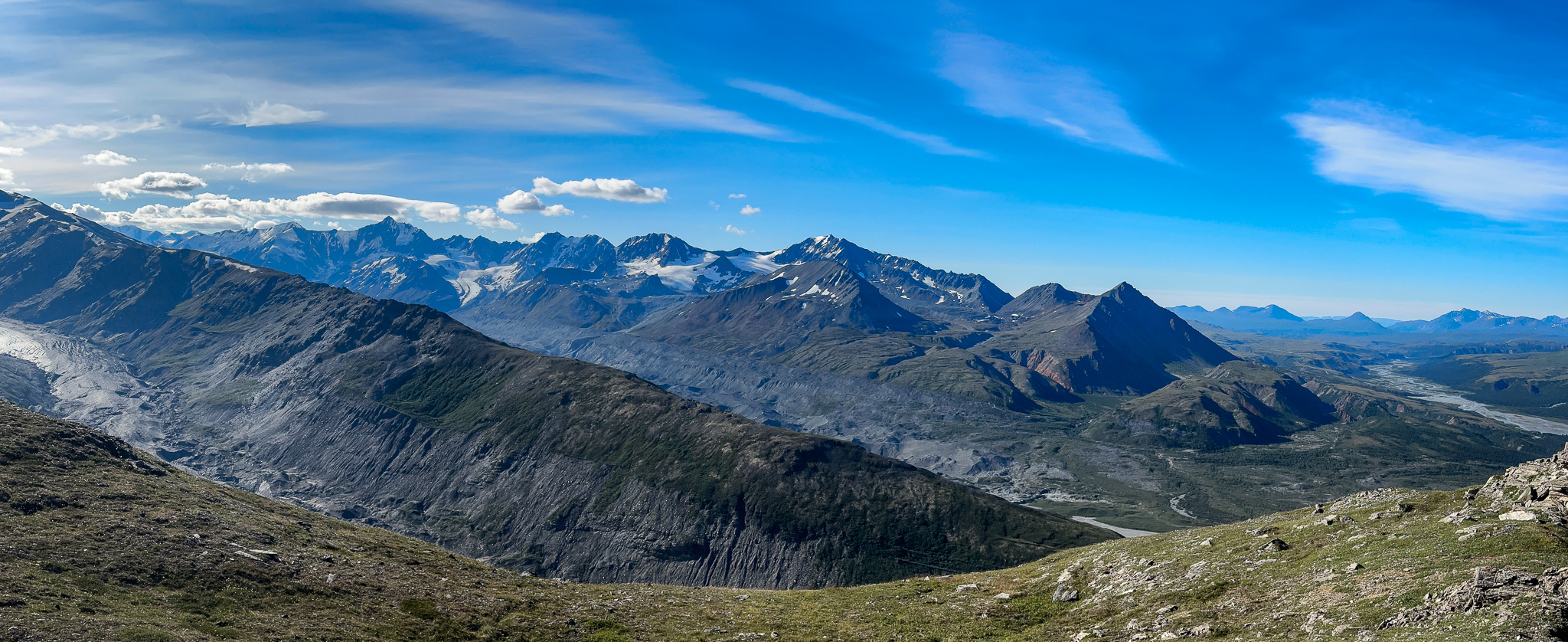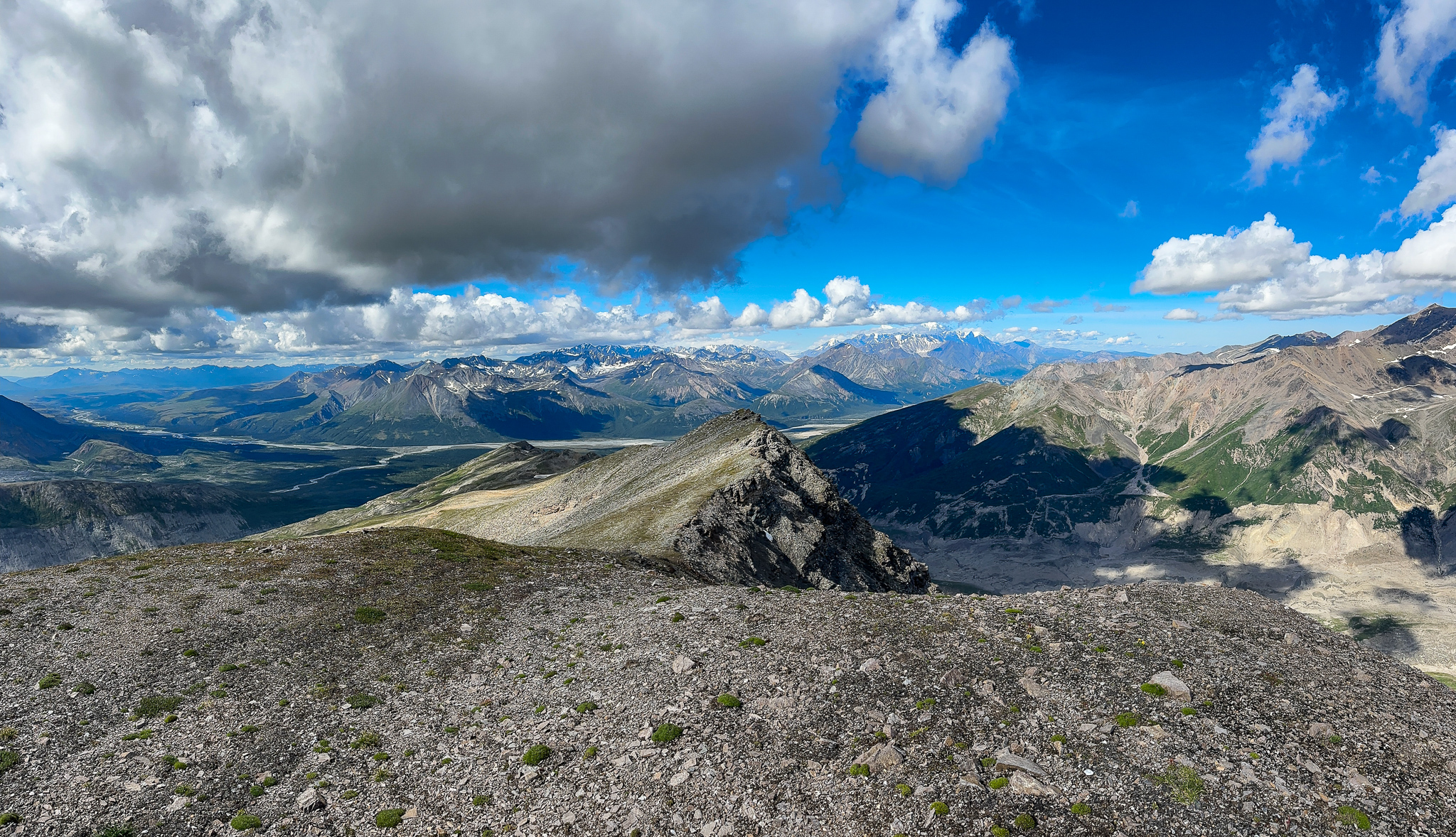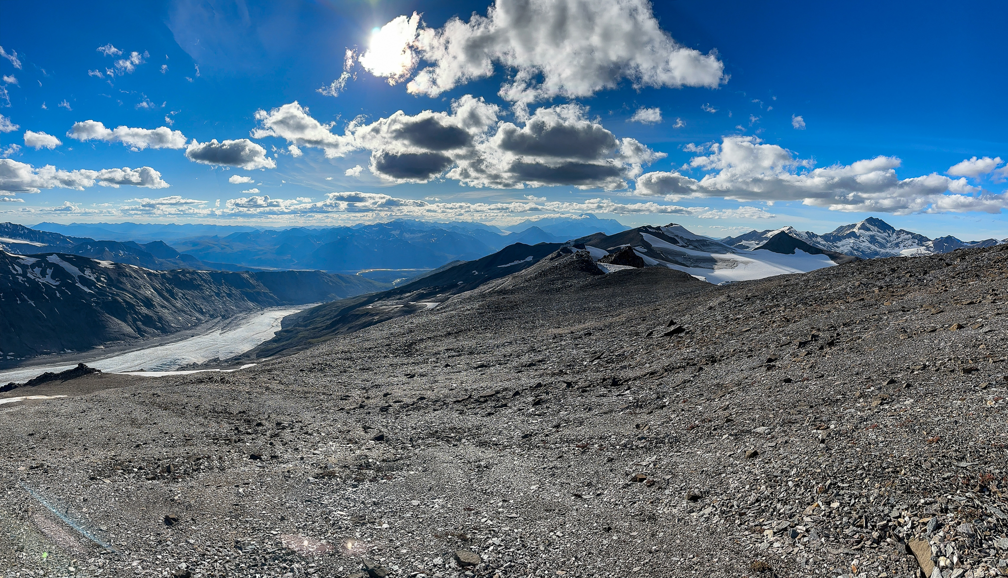 When we emerged from the tent, autumn had arrived in the Deltas. The air was 20F degrees cooler, though it wasn’t quite as windy as the previous day. The high clouds filled the sky above us and ominous lenticular clouds were building on the high peaks of the Deltas. Grant and I acknowledged our narrow weather window was closing and it was time to go home. I took a few more photos, though I was mostly sated. In retrospect, I should have climbed back up T2 to get a better view of the area, but we were so sick of that mountain that my mind avoided thinking about it. I entirely forgot to take a panoramic photo from the top of T2, so I’ll have to go back someday and do that.