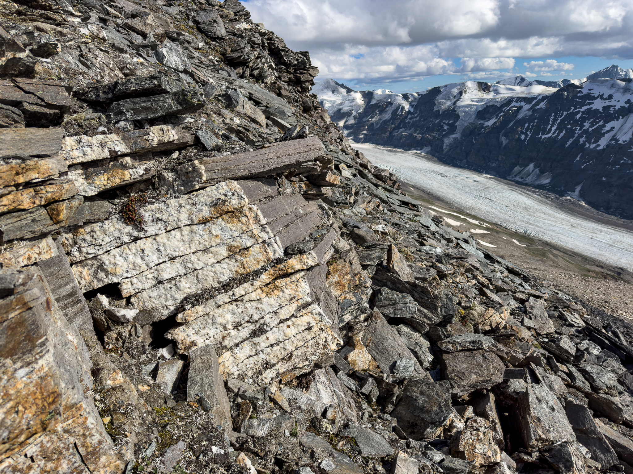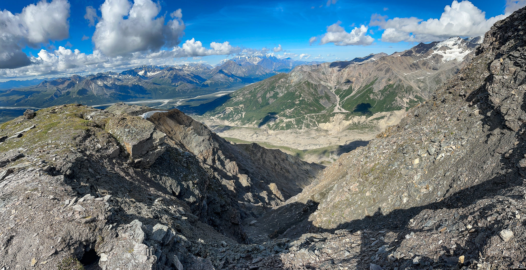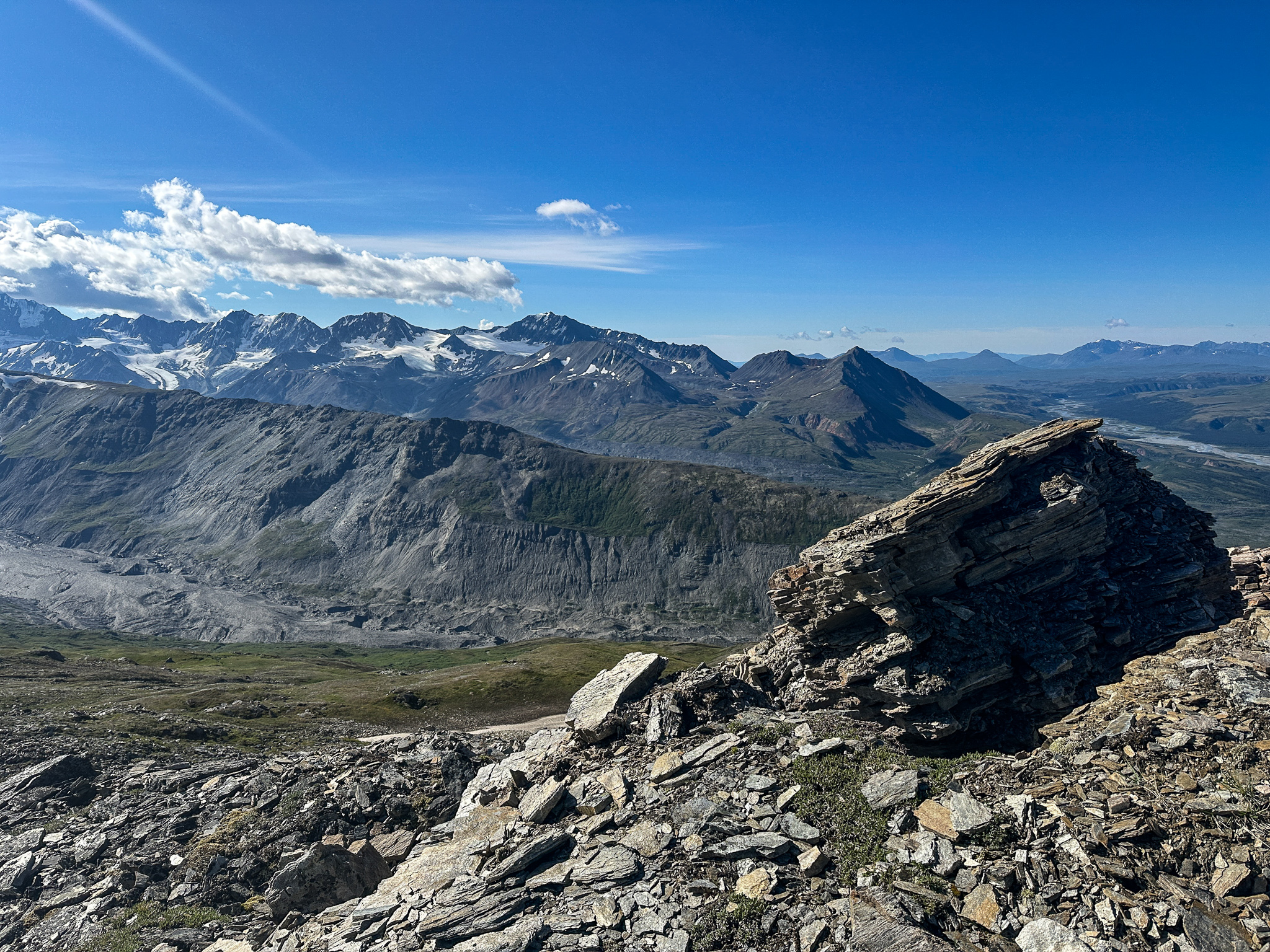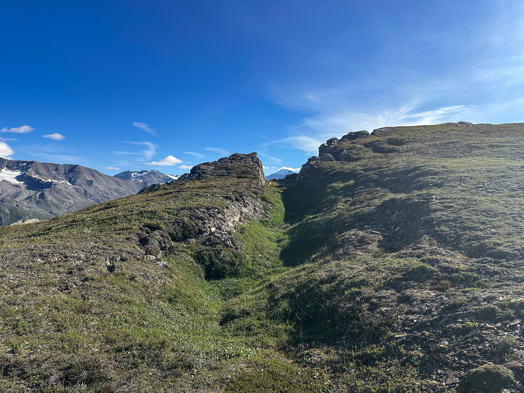 The previous day I had seen some research and found a large portion of the south side of the ridge was slowly sliding down towards the Fels Glacier. A landslide more than a mile wide! As we continued hiking up the ridge, we notices various…cracks and splits in the tundra indicating this was indeed occurring. Very very slowly, the slope was changing. The Denali fault is a mile or two to the south, below the Canwell Glacier. If there were a large (8.0-9.0 magnitude) earthquake right on the Denali Fault, the south face might collapse. I’m not sure how that would affect the top of the ridge, but it would be a dramatic change.
