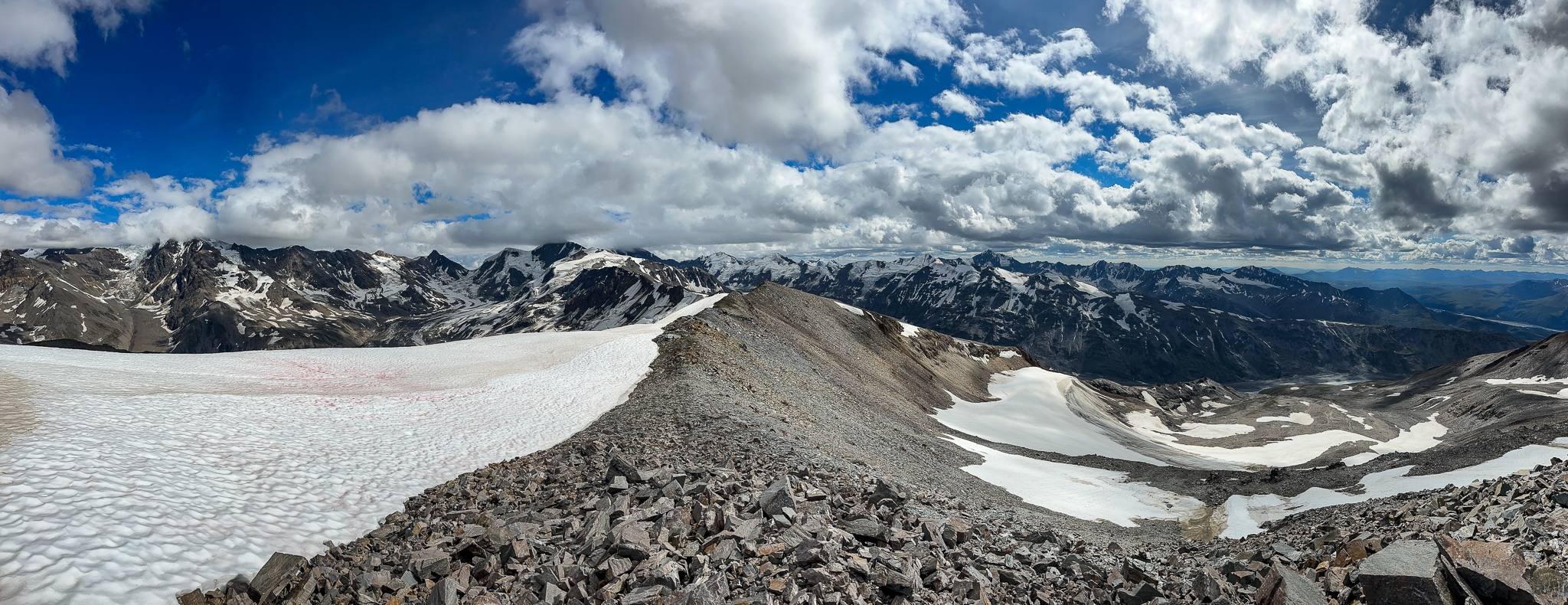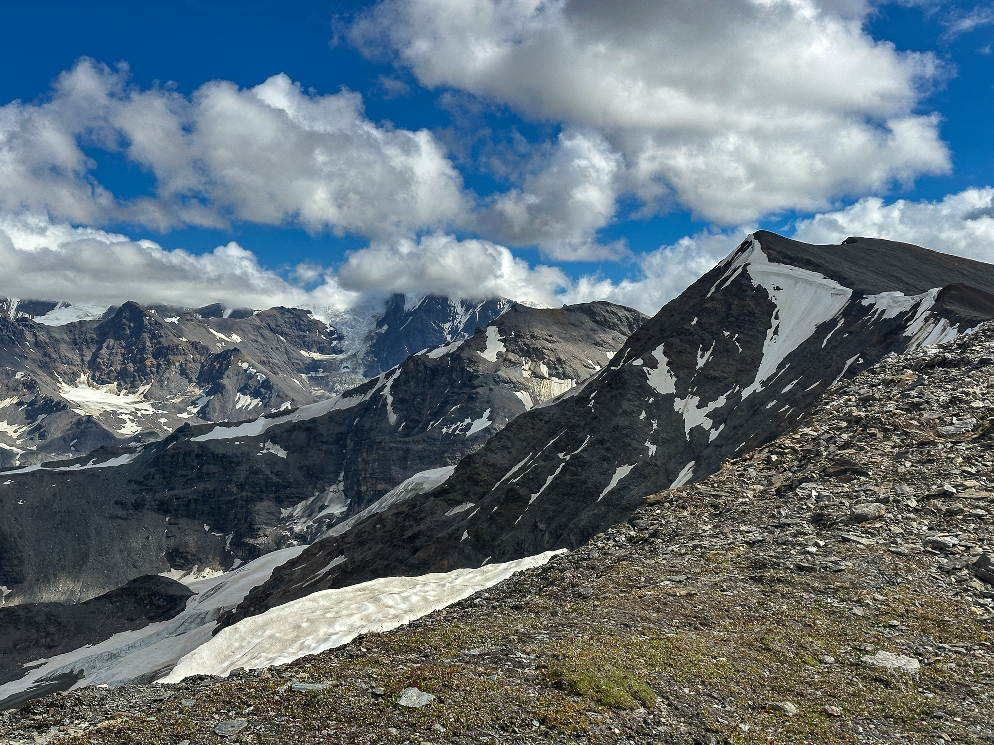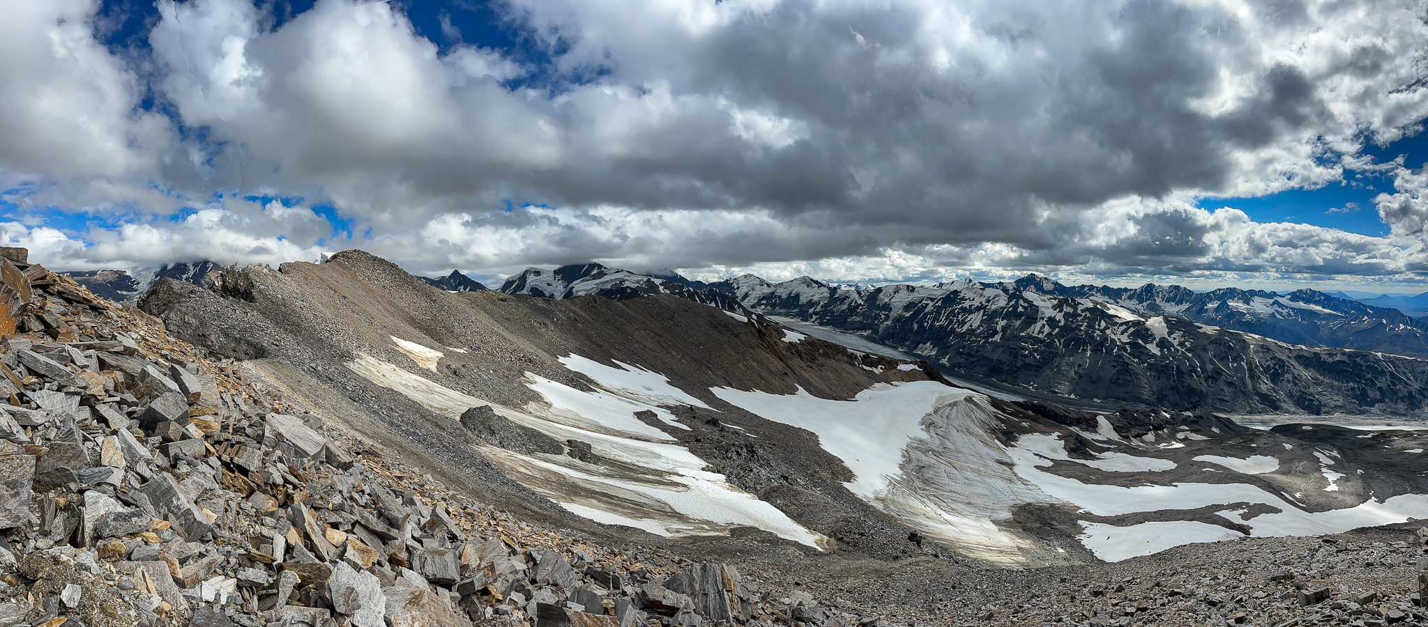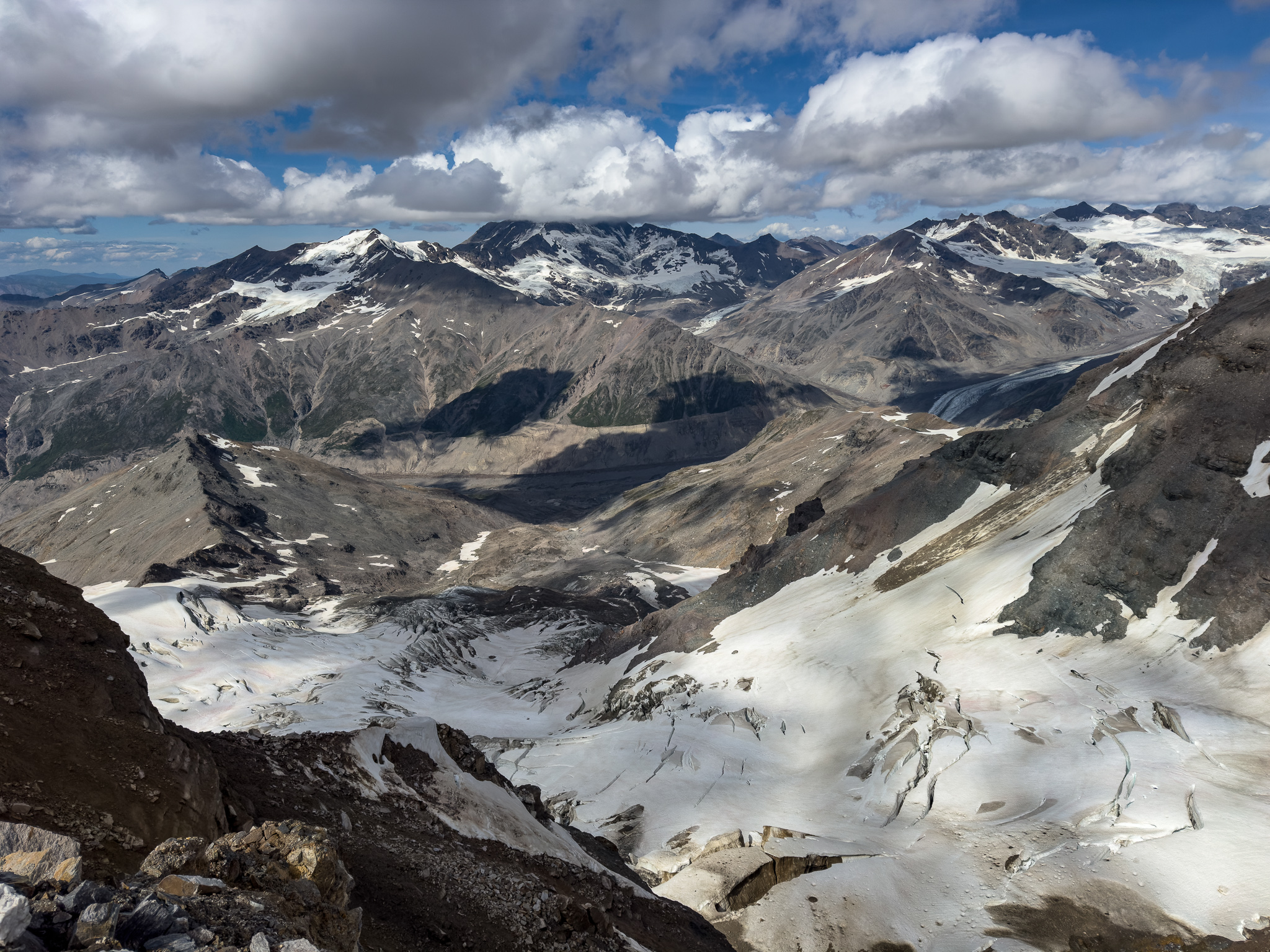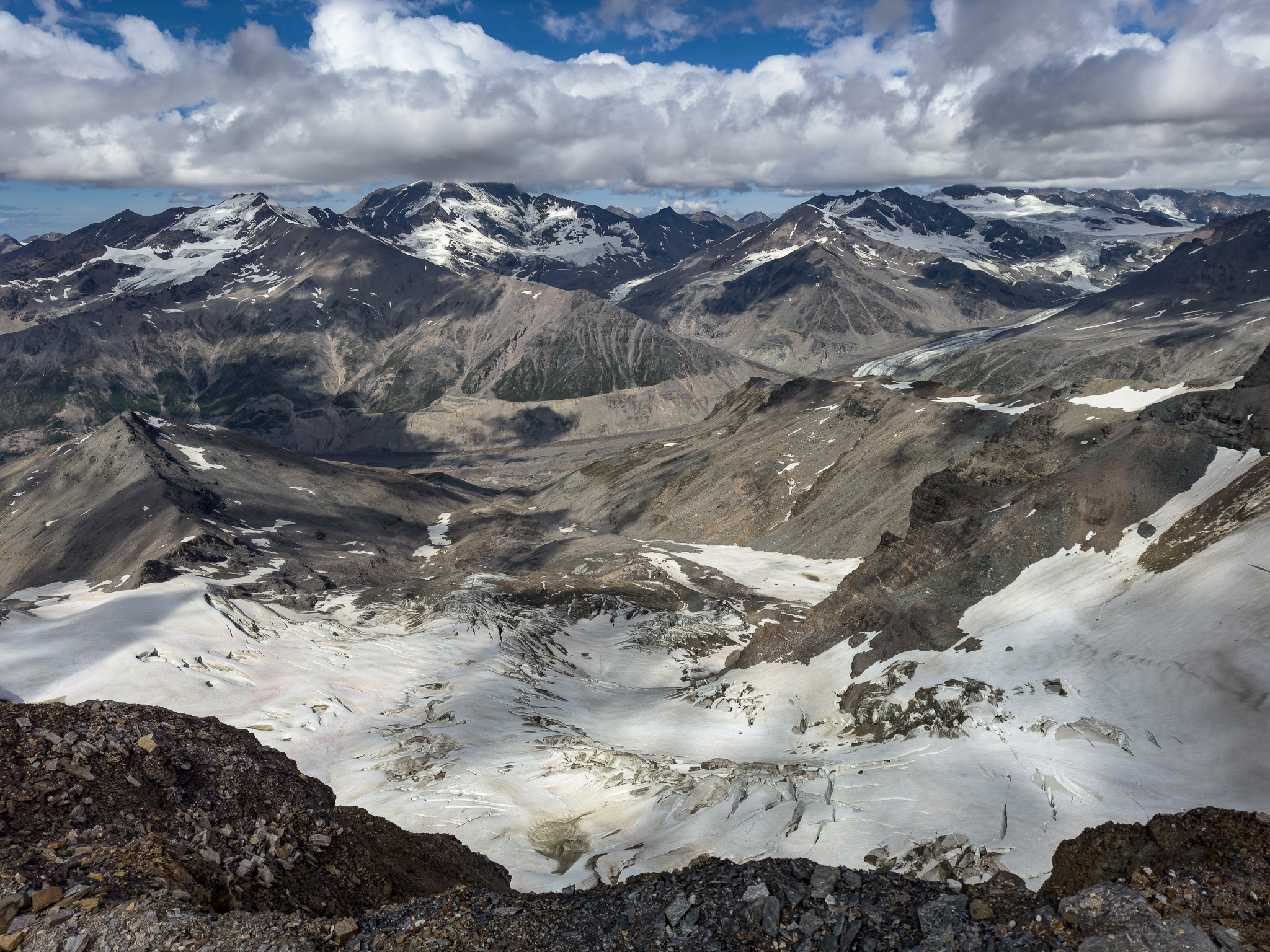 My attention was constantly on White Princess, I kept stopping when it looked as though the clouds might clear. The cloud ceiling raised and lowered by the second: 9,000′. 8,500′. 9,100′. 8,400′. 9,200’…they moved up and down the summit with the high winds. If I stopped and watched, I could see the pulsing of the dark clouds as they thrummed about the summit. As I had no guarantee the summit clouds would ever totally clear, I was repeatedly tempted into spending valuable time and camera battery taking 7+ photo panoramas of the cloudy summit, in hopes I could use photo-editing magic (dehaze) to clear them away. Would this entire trip be a failure in my mind if the clouds did not clear? I tried to steer my thoughts away from valutions of individual expereinces and focus on the whole, even though a clear view of the summit was the attractor to get out here. The trip so far has been a blast, it was great to be back in the big mountains with Grant for the first time in years and the views from this section of the ridge were even more grand than from T3 or T2 despite the clouds. I wish he could have joined me but his heels were forming large blisters and I didn’t blame him for staying at camp. The travel on this section of the ridge was easy and there were a lot of unique rock features and incredible glacier views in all directions. The clouds continued to undulate.