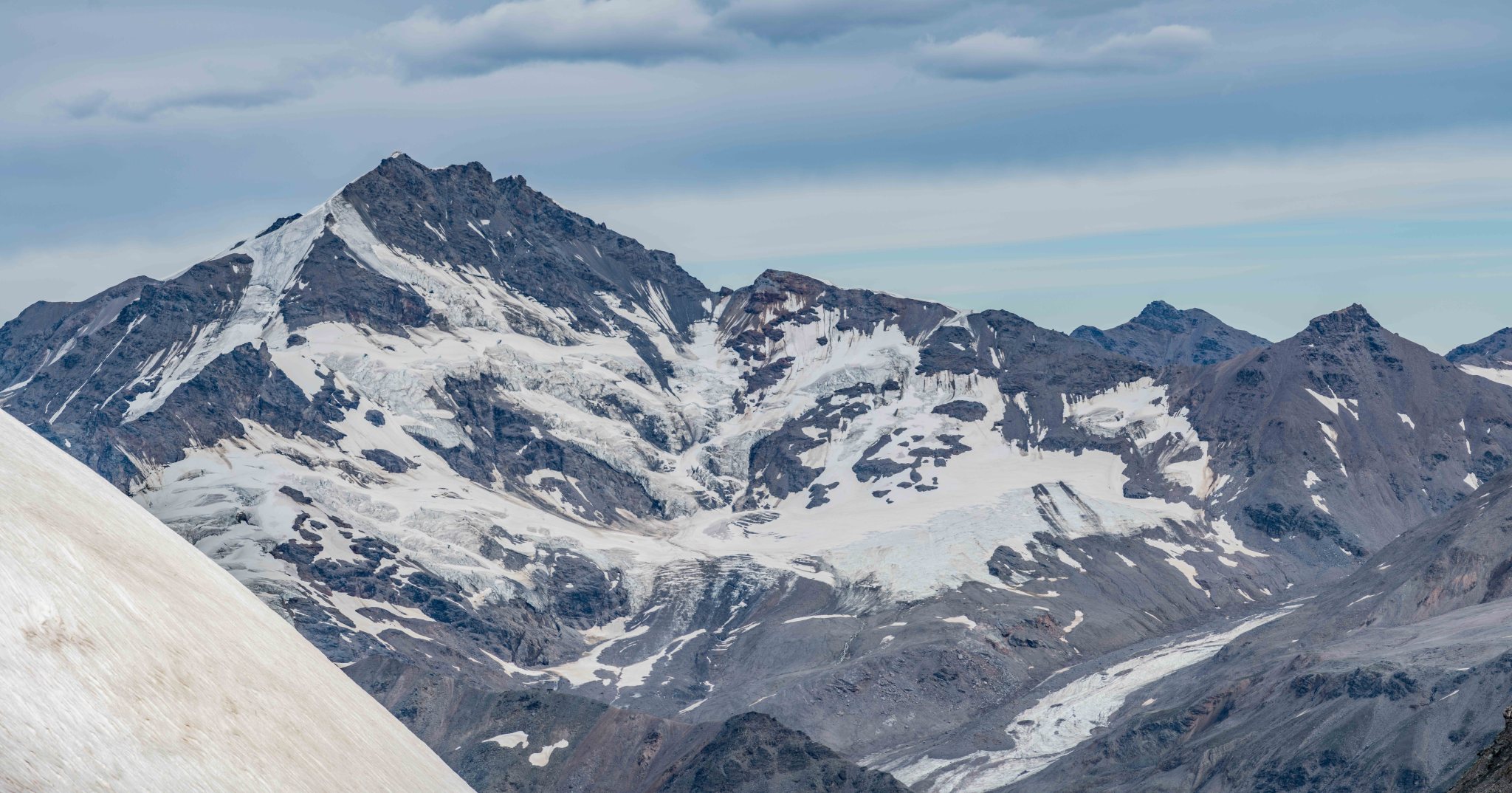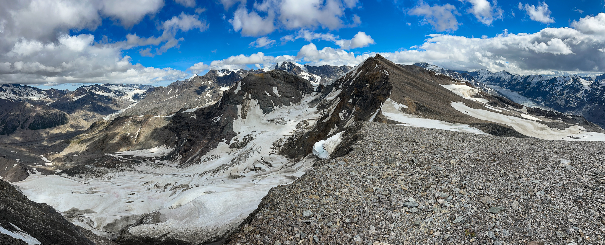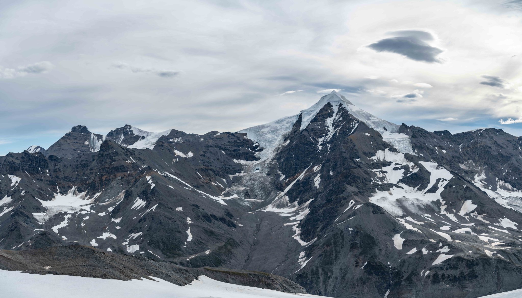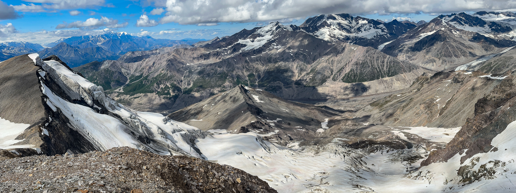 My attention was constantly on White Princess, I kept stopping when it looked as though the clouds might clear. The cloud ceiling raised and lowered by the second: 9,000′. 8,500′. 9,100′. 8,400′. 9,200’…they moved up and down the summit with the high winds. If I stopped and watched, I could see the pulsing of the dark clouds as they thrummed about the summit. As I had no guarantee the summit clouds would ever totally clear, I was repeatedly tempted into spending valuable time and camera battery taking 7+ photo panoramas of the cloudy summit, in hopes I could use photo-editing magic (dehaze) to clear them away. Would this entire trip be a failure in my mind if the clouds did not clear? I tried to steer my thoughts away from valutions of individual expereinces and focus on the whole, even though a clear view of the summit was the attractor to get out here. The trip so far has been a blast, it was great to be back in the big mountains with Grant for the first time in years and the views from this section of the ridge were even more grand than from T3 or T2 despite the clouds. I wish he could have joined me but his heels were forming large blisters and I didn’t blame him for staying at camp. The travel on this section of the ridge was easy and there were a lot of unique rock features and incredible glacier views in all directions. The clouds continued to undulate.