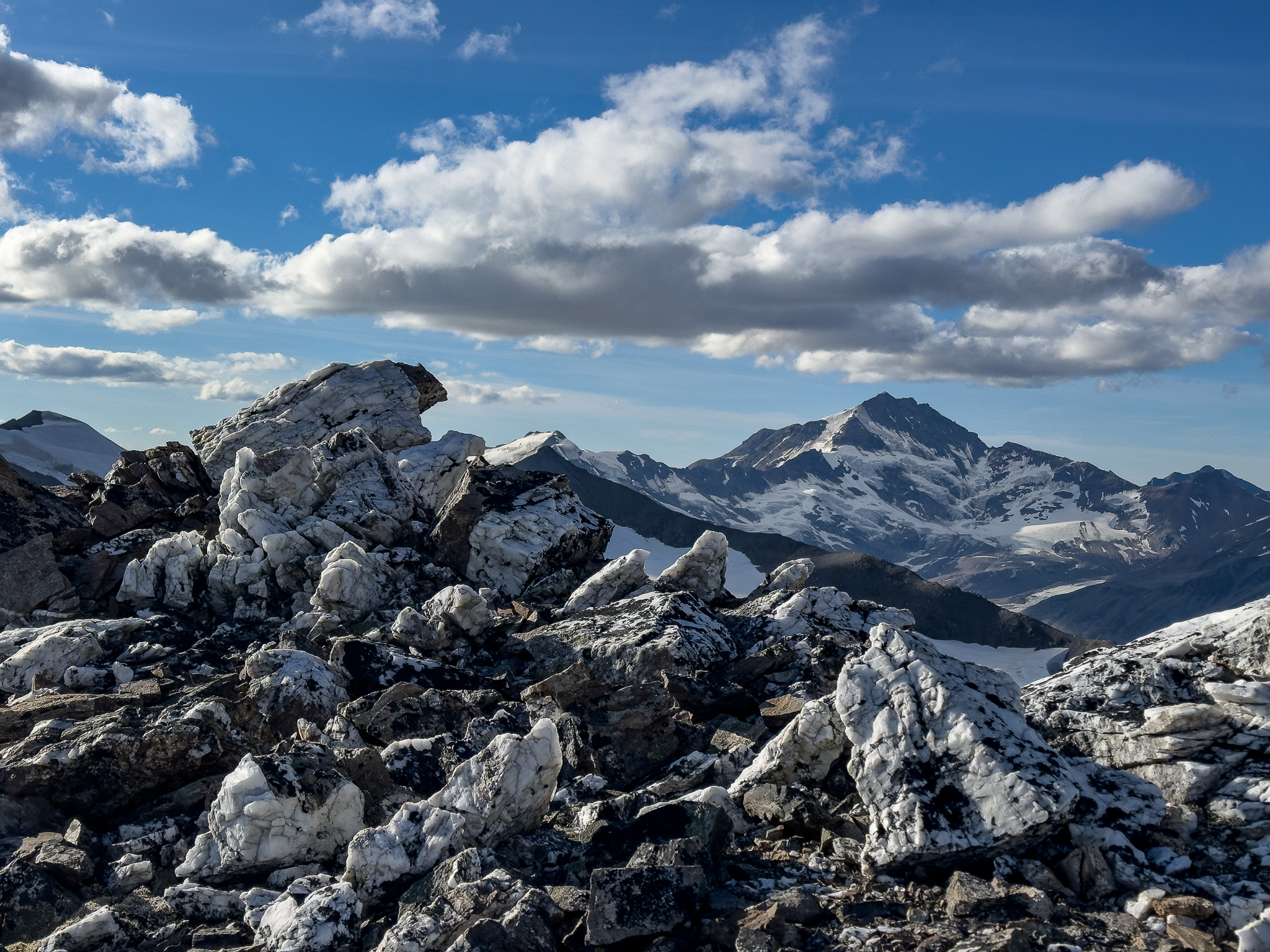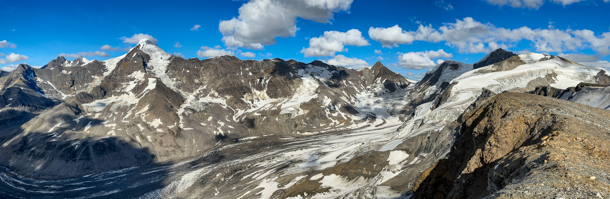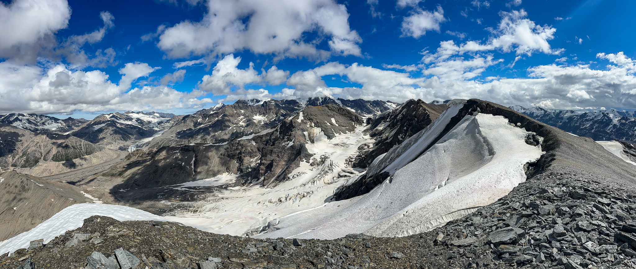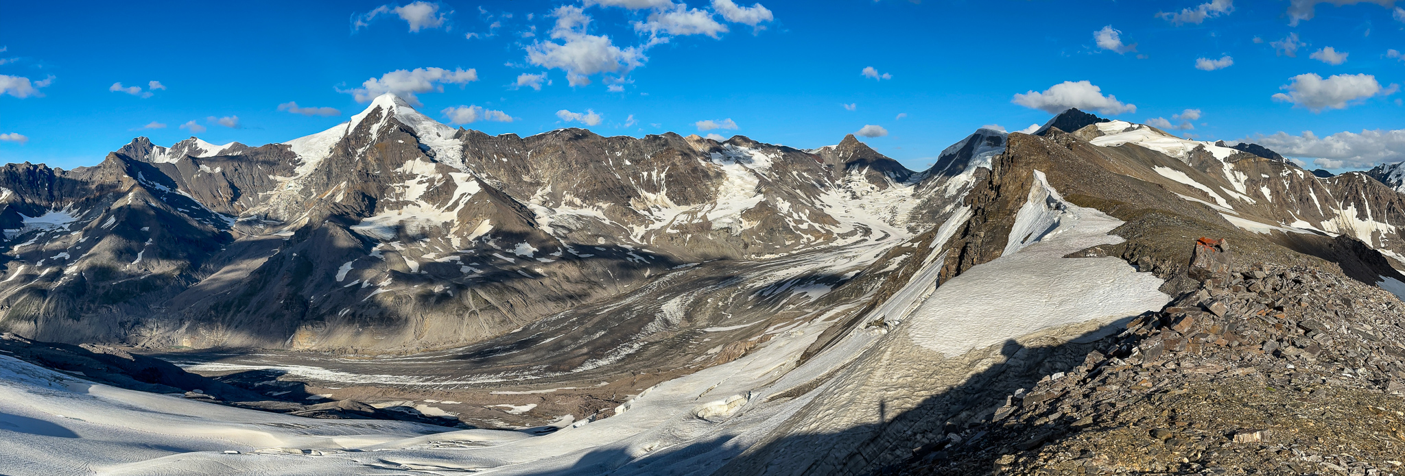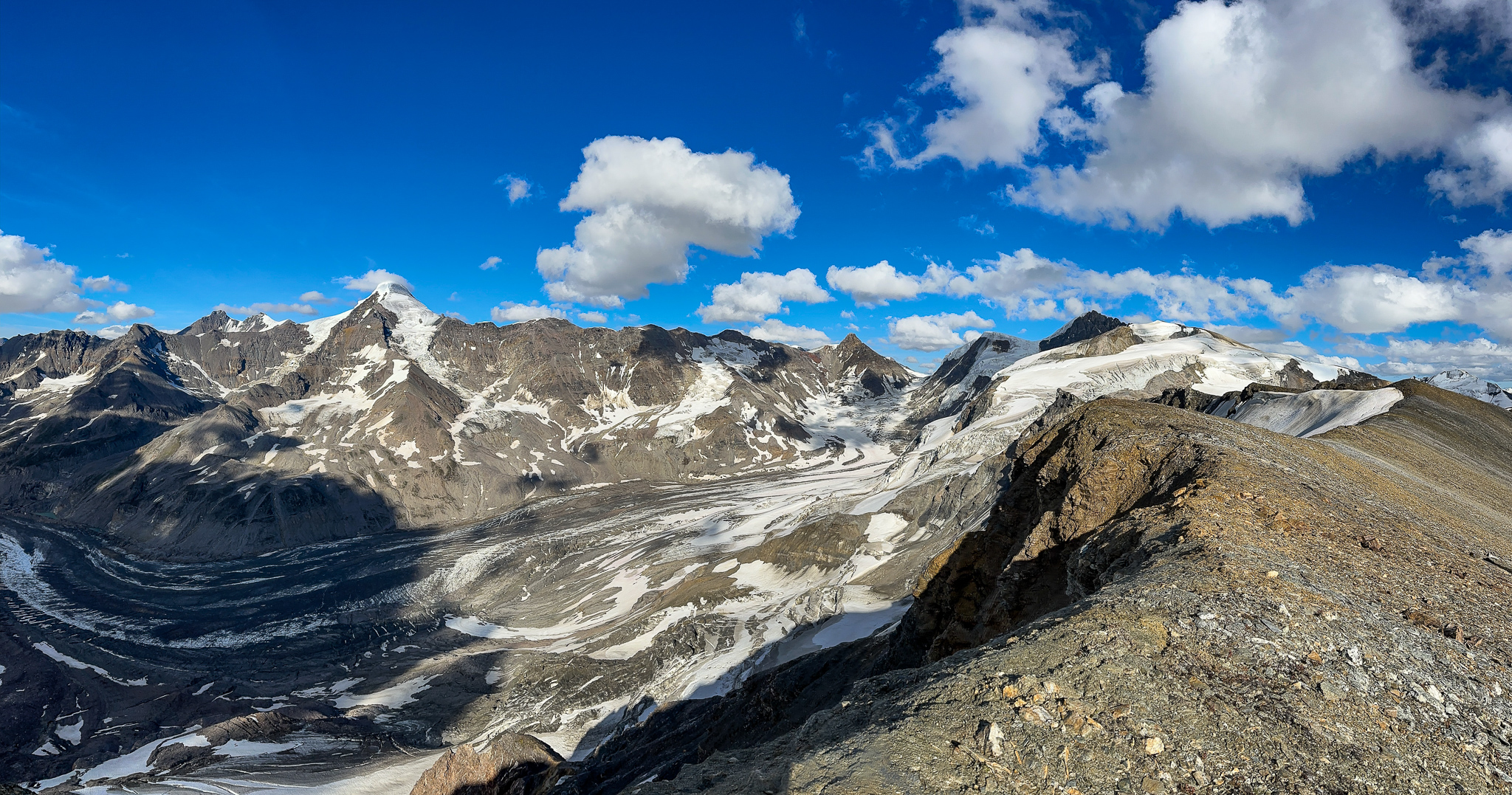 My attention was constantly on White Princess, I kept stopping when it looked as though the clouds might clear. The cloud ceiling raised and lowered by the second: 9,000′. 8,500′. 9,100′. 8,400′. 9,200’…they moved up and down the summit with the high winds. If I stopped and watched, I could see the pulsing of the dark clouds as they thrummed about the summit. As I had no guarantee the summit clouds would ever totally clear, I was repeatedly tempted into spending valuable time and camera battery taking 7+ photo panoramas of the cloudy summit, in hopes I could use photo-editing magic (dehaze) to clear them away. Would this entire trip be a failure in my mind if the clouds did not clear? I tried to steer my thoughts away from valutions of individual expereinces and focus on the whole, even though a clear view of the summit was the attractor to get out here. The trip so far has been a blast, it was great to be back in the big mountains with Grant for the first time in years and the views from this section of the ridge were even more grand than from T3 or T2 despite the clouds. I wish he could have joined me but his heels were forming large blisters and I didn’t blame him for staying at camp. The travel on this section of the ridge was easy and there were a lot of unique rock features and incredible glacier views in all directions. The clouds continued to undulate.