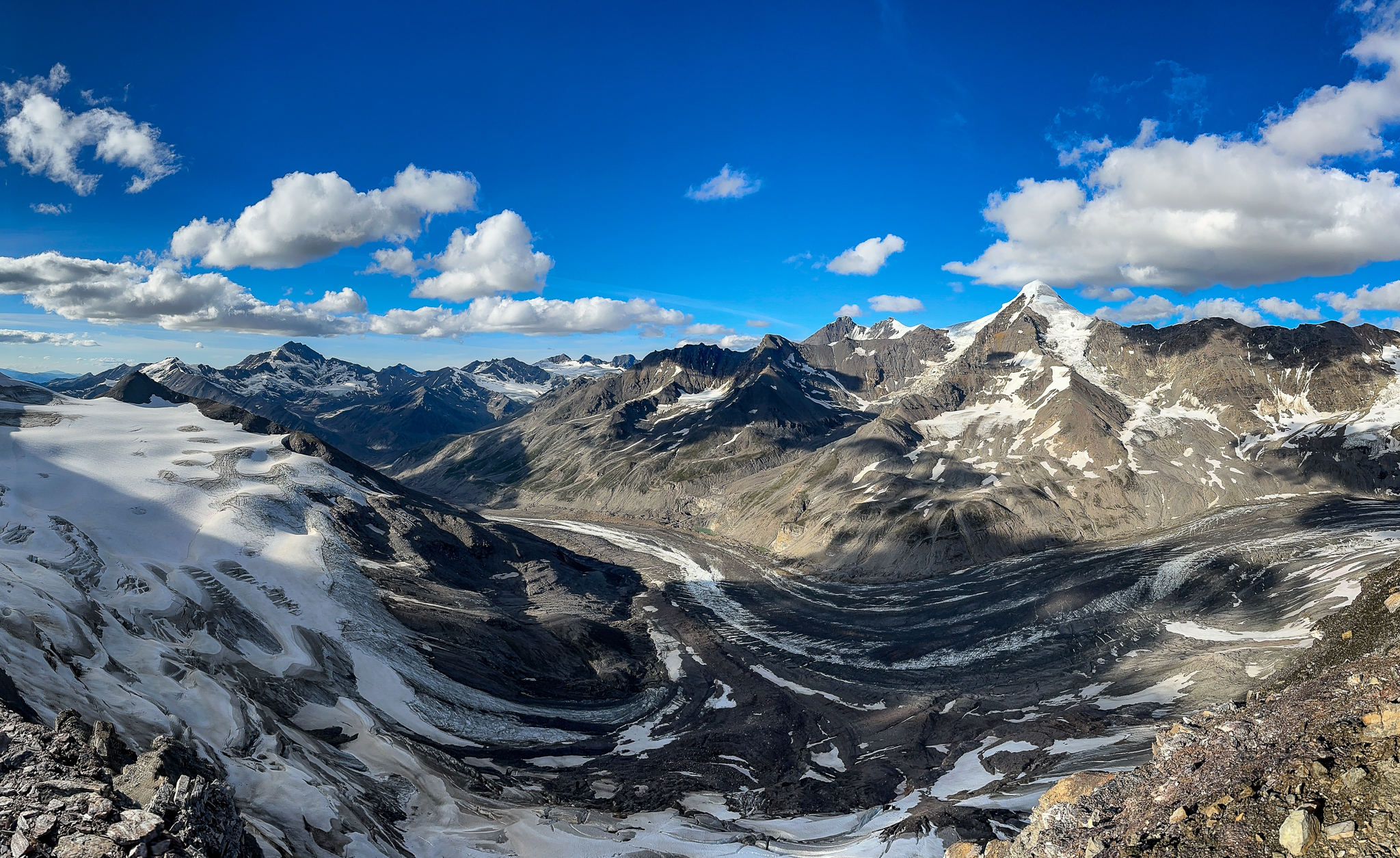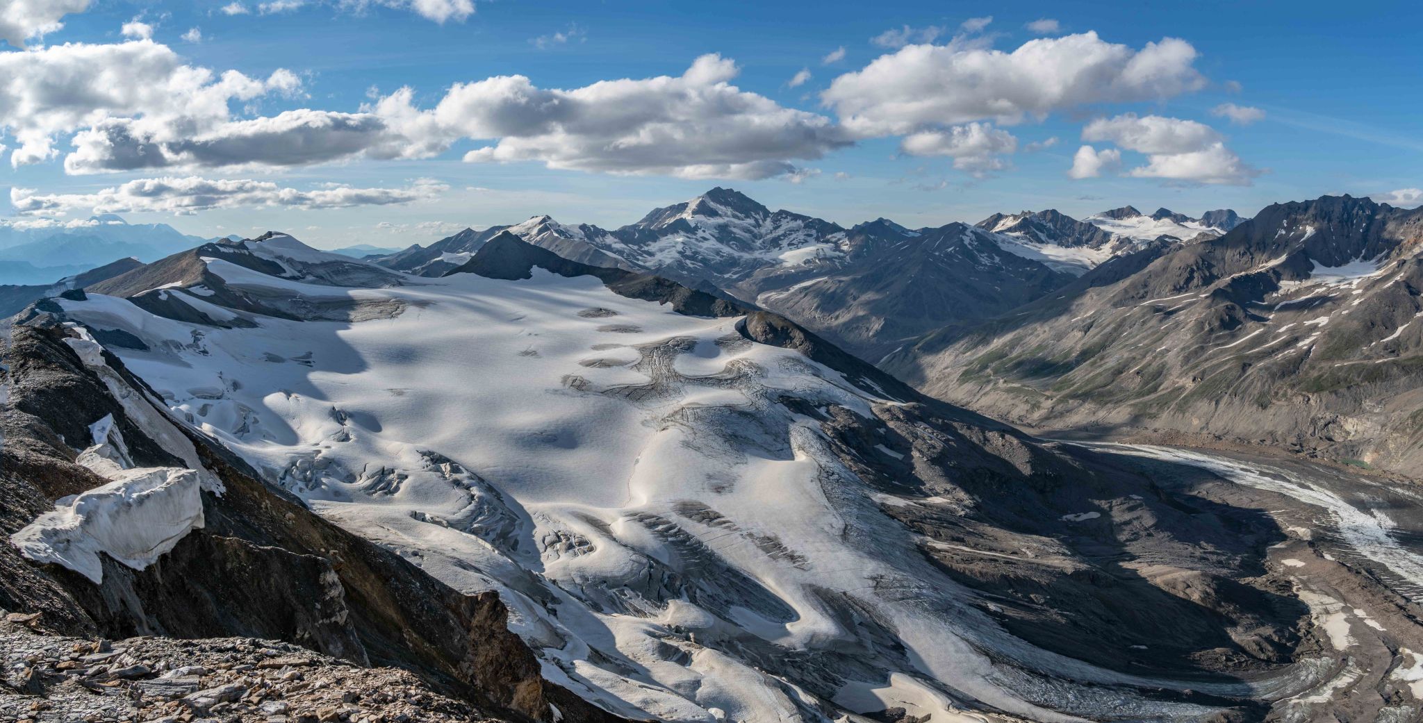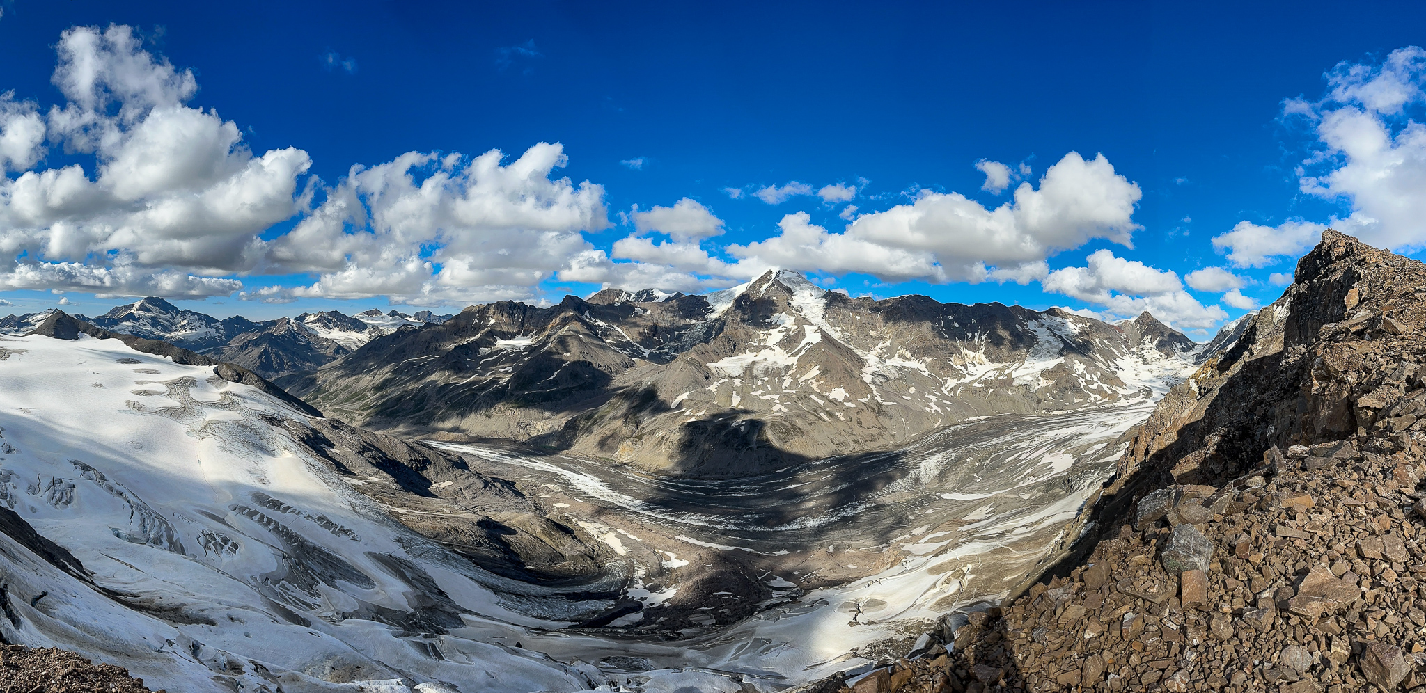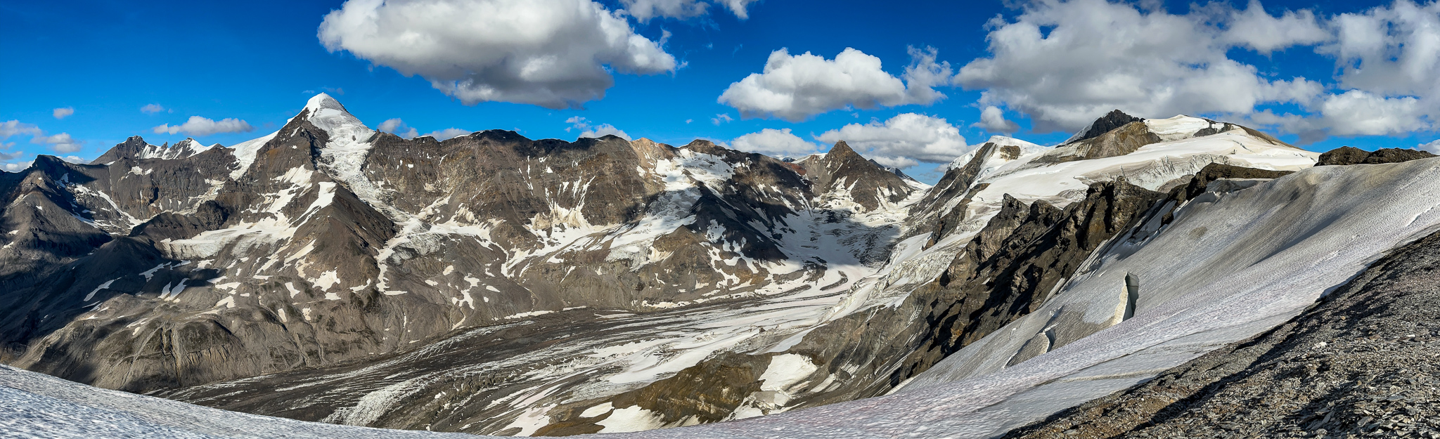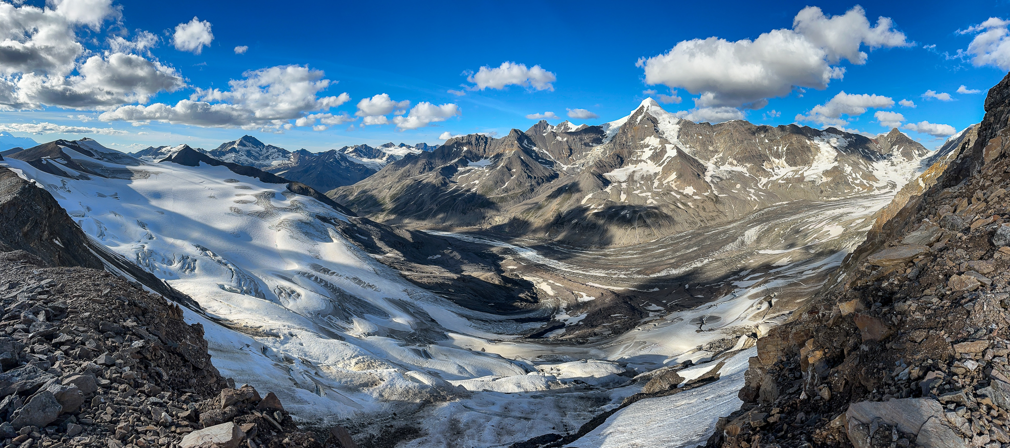 My attention was constantly on White Princess, I kept stopping when it looked as though the clouds might clear. The cloud ceiling raised and lowered by the second: 9,000′. 8,500′. 9,100′. 8,400′. 9,200’…they moved up and down the summit with the high winds. If I stopped and watched, I could see the pulsing of the dark clouds as they thrummed about the summit. As I had no guarantee the summit clouds would ever totally clear, I was repeatedly tempted into spending valuable time and camera battery taking 7+ photo panoramas of the cloudy summit, in hopes I could use photo-editing magic (dehaze) to clear them away. Would this entire trip be a failure in my mind if the clouds did not clear? I tried to steer my thoughts away from valutions of individual expereinces and focus on the whole, even though a clear view of the summit was the attractor to get out here. The trip so far has been a blast, it was great to be back in the big mountains with Grant for the first time in years and the views from this section of the ridge were even more grand than from T3 or T2 despite the clouds. I wish he could have joined me but his heels were forming large blisters and I didn’t blame him for staying at camp. The travel on this section of the ridge was easy and there were a lot of unique rock features and incredible glacier views in all directions. The clouds continued to undulate.
