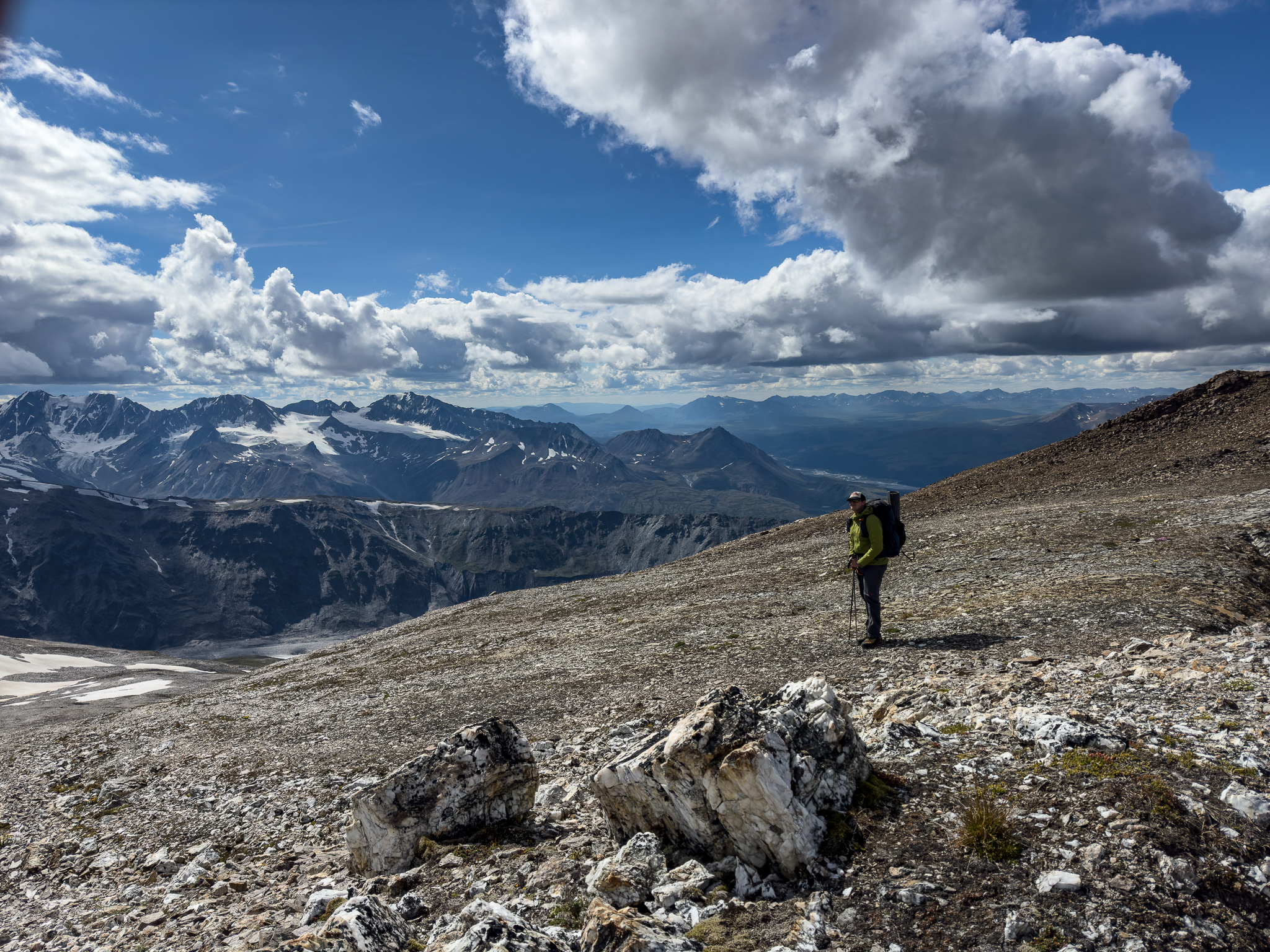 After seeing Stan Justice’s email in 2020 noting the route was clear, I drove to the Deltas and climbed a few miles up the Castner-Fels Divide. The ascent from the Castner Creek to the alpine took less than half an hour! Kiro and I camped about 3 miles from the road and weathered many rainstorms that rolled across the Deltas from the south. I hiked up to the first of many false summits on the ridge and marveled at the beautiful and endless expanse of terrain above me. I wanted to hike further but didn’t have the time or weather for such an attempt, but I knew the ridge would go, I knew fellow AAC member Chad Diesinger had summitted Triangle via the ridge in September of 2015. Stan said it’s allegedly been traveled all the way back to Snow White!