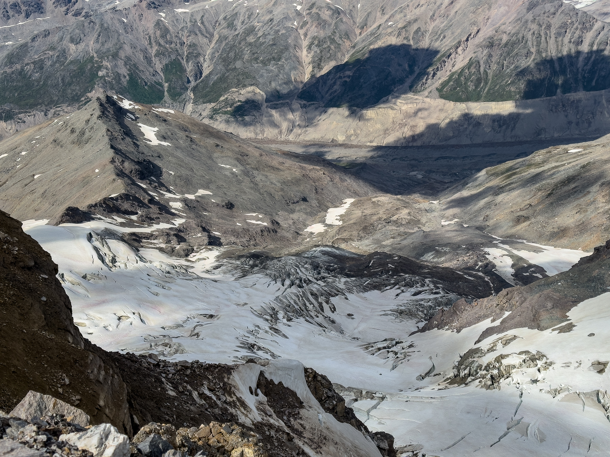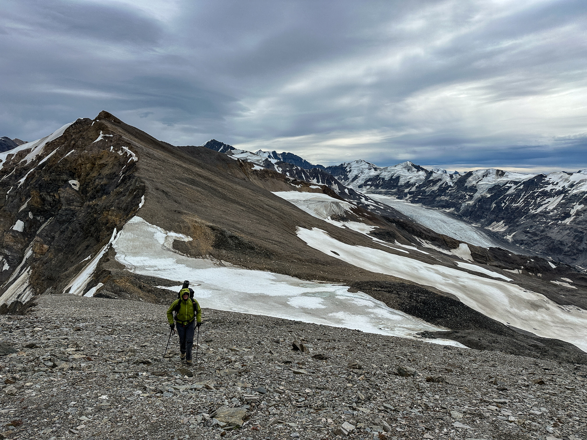 We made water, coffee, and breakfast, decamped, packed up, and started our return. Instead of the annoying but scenic traverse along T2’s ridgeline, we dropped elevation from camp immediately and traversed along the glacial till above the remnant glacier on the south side of T2. We took a very efficient path back down the ridge, the only detour I took was to top out on T3 again for more photos. Broken Glacier was still astoundingly thick up high, essentially a firn line that nearly became a terminal moraine, with only a little bare ice in between. Grant again didn’t bother with the top of T3.