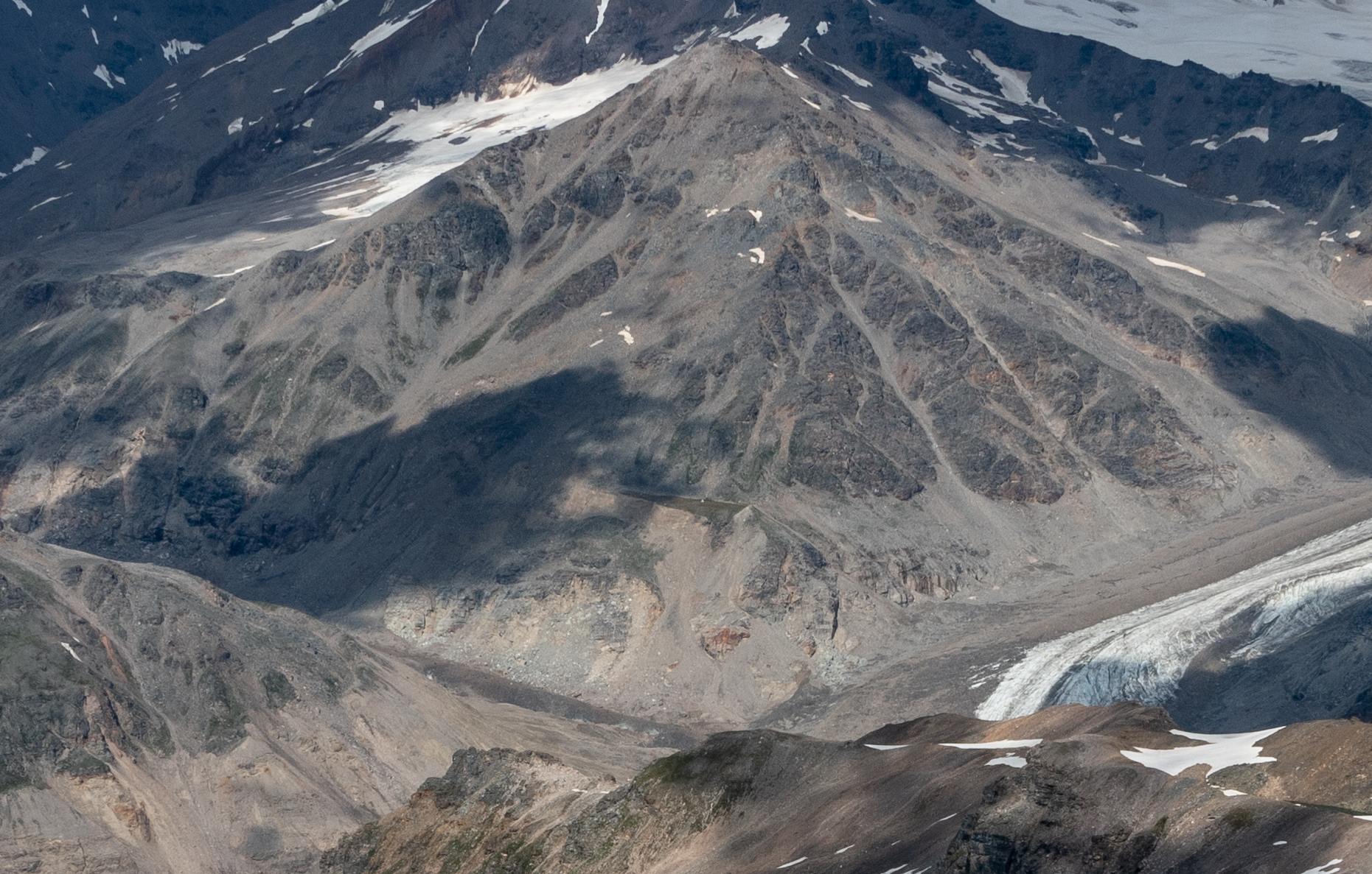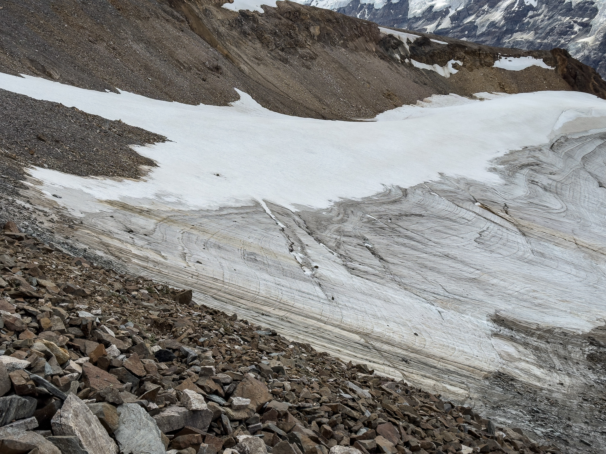We spied Old Snowy on our way back and the ice loss on that peak is noticeable, especially around the edges. The rocks that are melting out have been releasing scree, which will accelerate the melting of the underlying ice. I doubt there will be any glacial ice on the summit mound itself in a decade, though the famous Ramp will likely still hold ice for a bit longer.