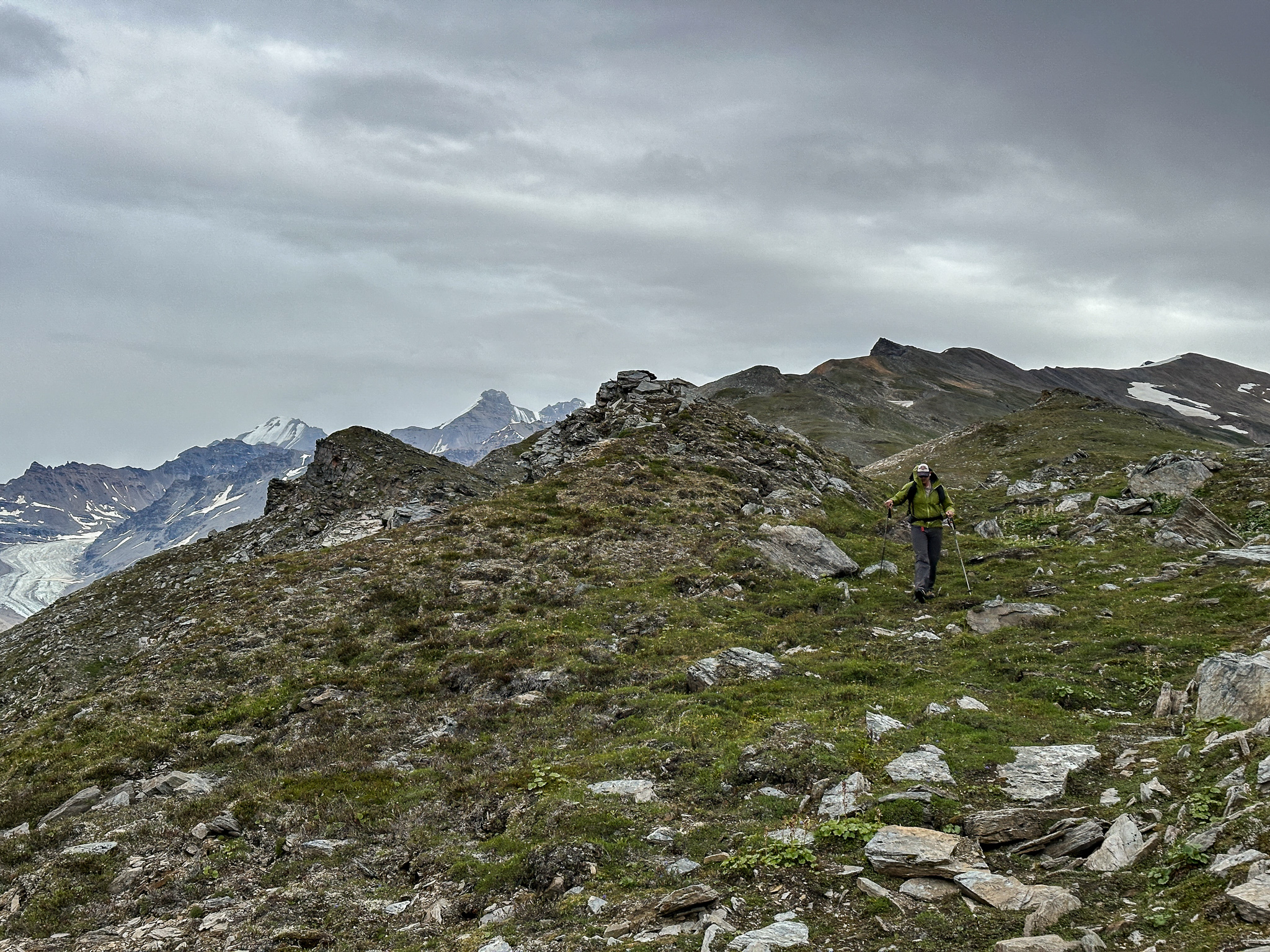 Trying to leave these thoughts behind me, I would hike ahead of Grant and his blistered feet, take photos until he caught up, then hike ahead once. I put my camera away a few times, thinking rain was imminent, but it never touched us. We had nice views of the Fels Valley with Snow White at its head to the southwest, the Canwell Valley on the other side of the Fels-Canwell Divide, as well as Silvertip and Item to the north.